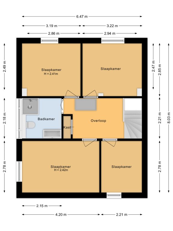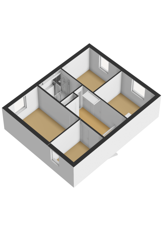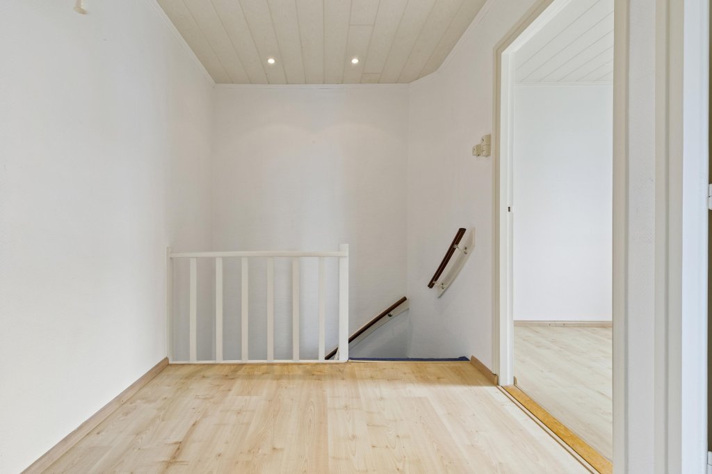 De overloop biedt toegang tot vier slaapkamers en de badkamer.