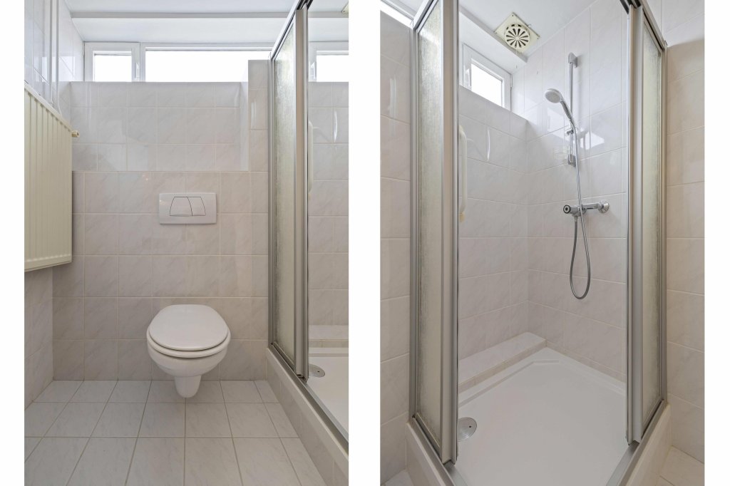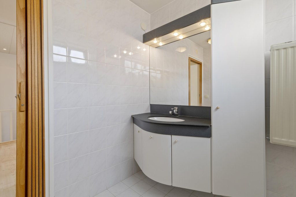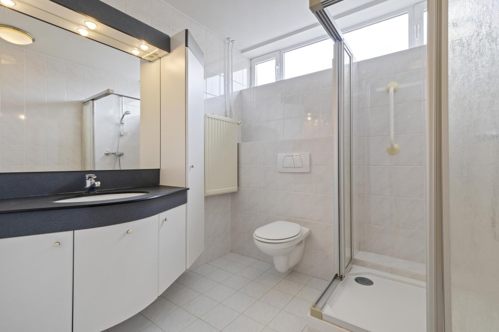 De badkamer beschikt over een douche, tweede toilet en wastafel met meubel.