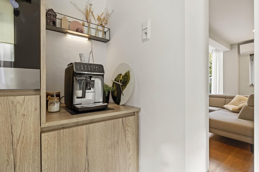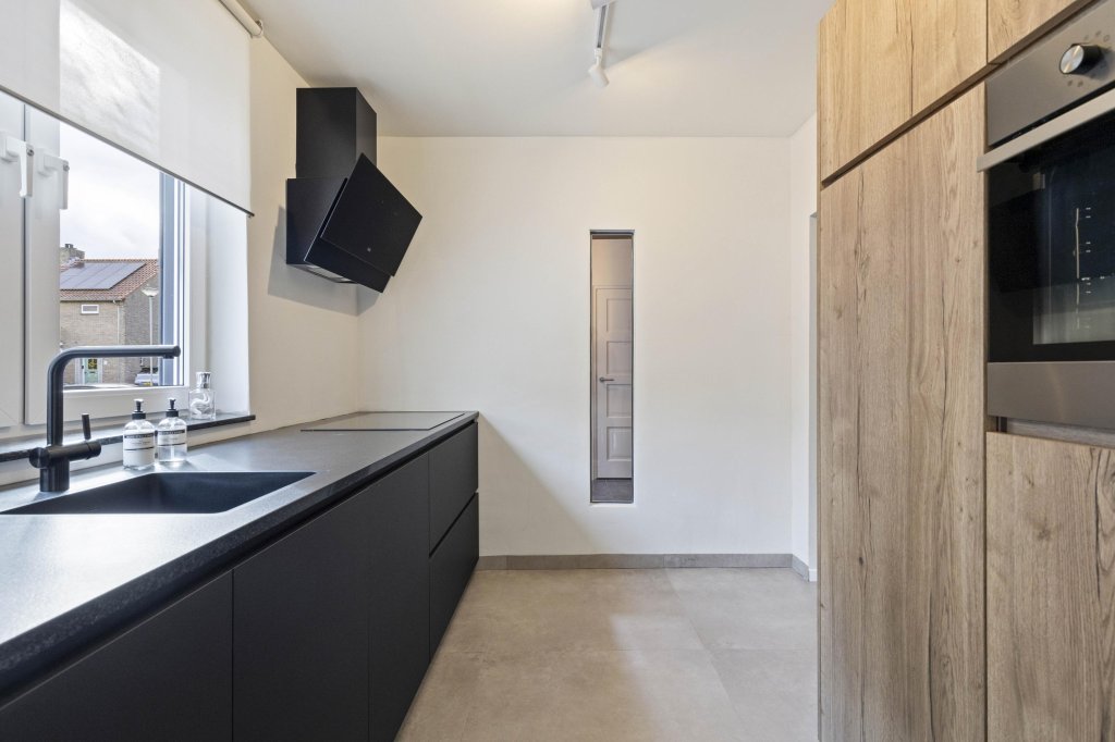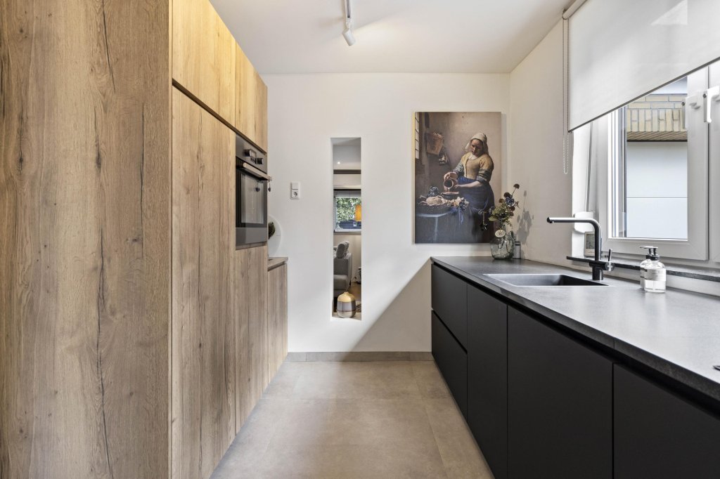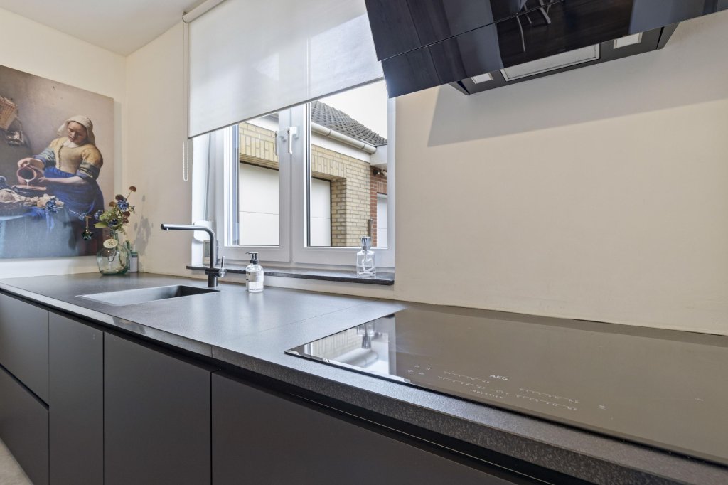 De semi-open keuken is modern ingericht en voorzien van een 4-pits inductiekookplaat, afzuigkap, koelkast en combi-oven.
