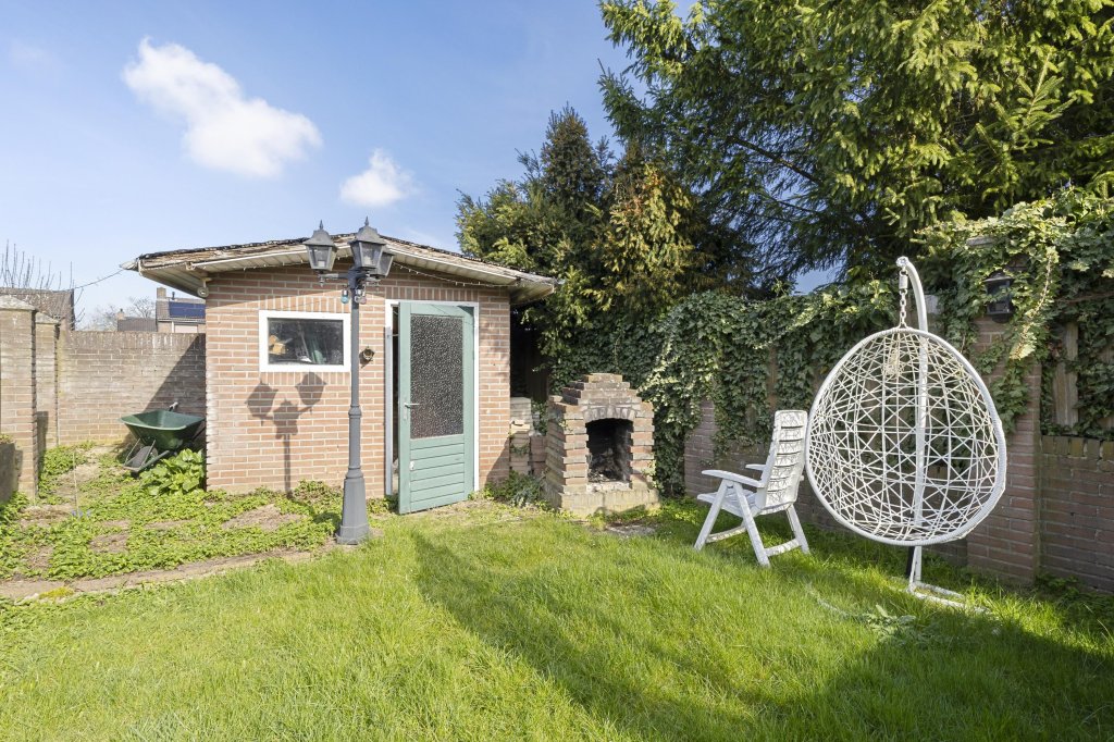 Deur naar diepe, omsloten tuin met tuinhuis en diverse tuinbergingen.