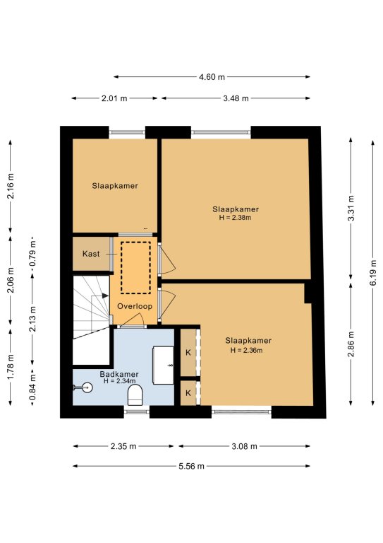 Overloop met bergkast en drie slaapkamers met laminaatvloeren, respectievelijk: