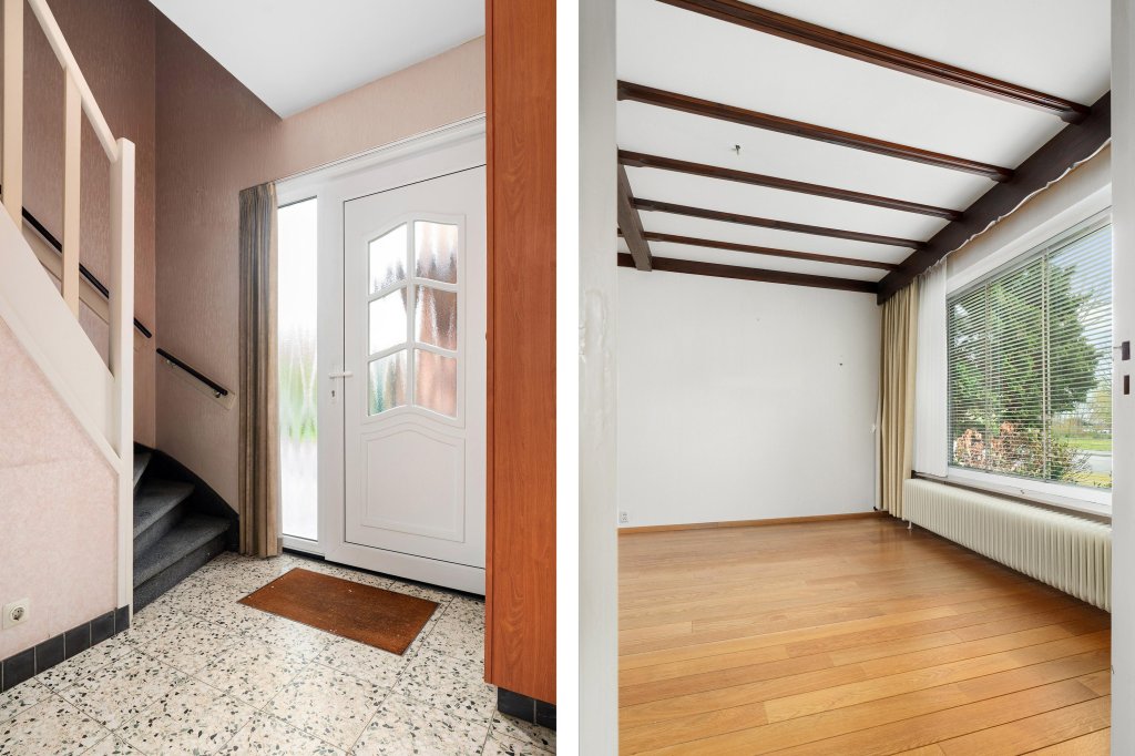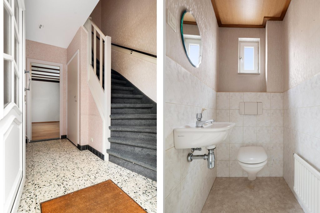 U betreedt de woning via de hal met toegang tot de meterkast en het volledig betegelde toilet met closet en fonteintje. Vanuit de hal leidt de vaste trap, met praktische trapkast, naar de eerste verdieping.