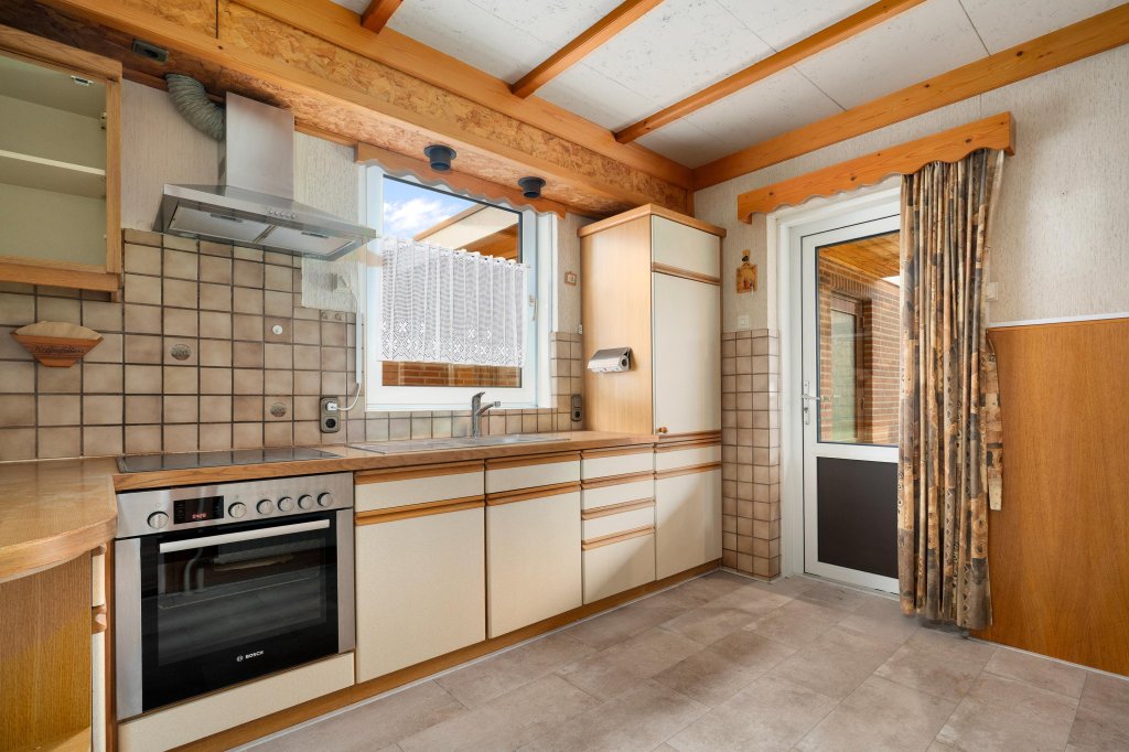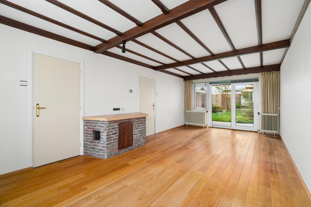 De ruime doorzonwoonkamer met parketvloer staat in verbinding met de tuin door een schuifpui. De eenvoudige keuken is uitgerust met onder andere een inductiekookplaat, spoelbak, koelkast, diepvries en oven.