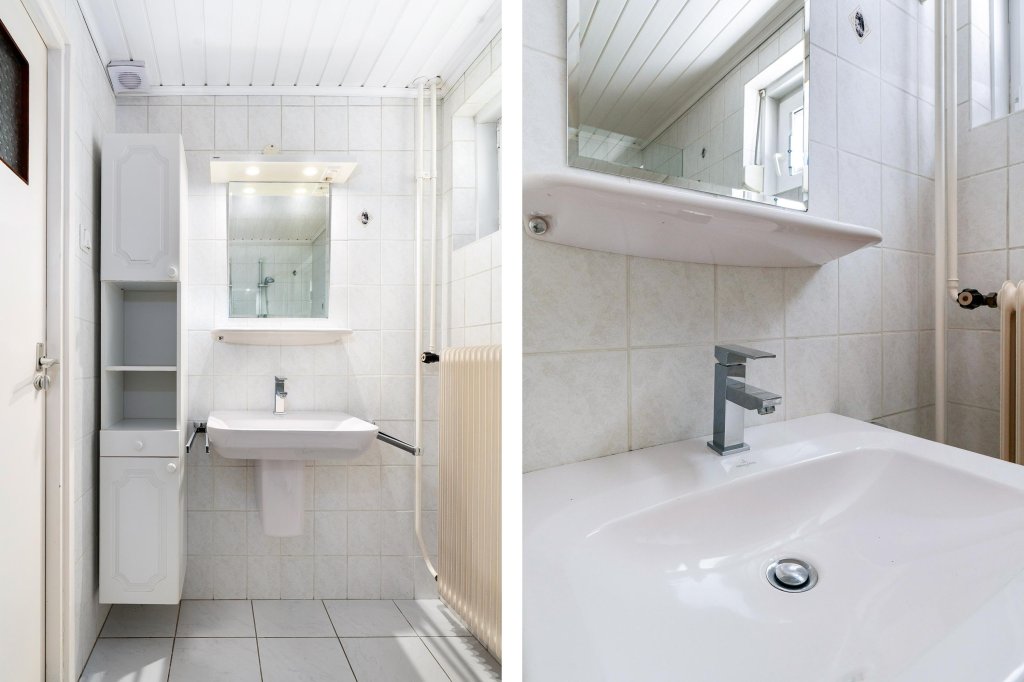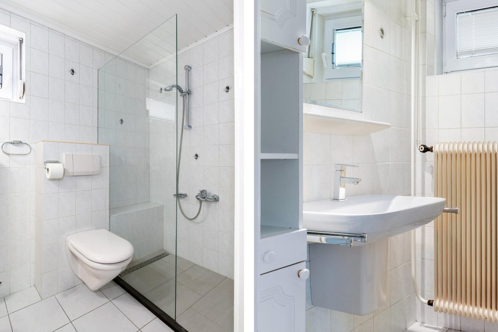 De geheel betegelde badkamer is uitgerust met een inloopdouche, wastafel in meubel en 2e toilet