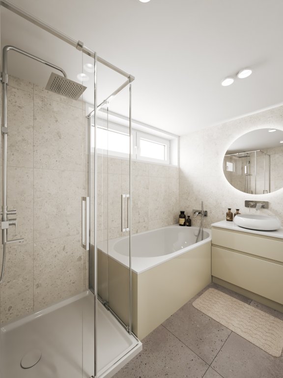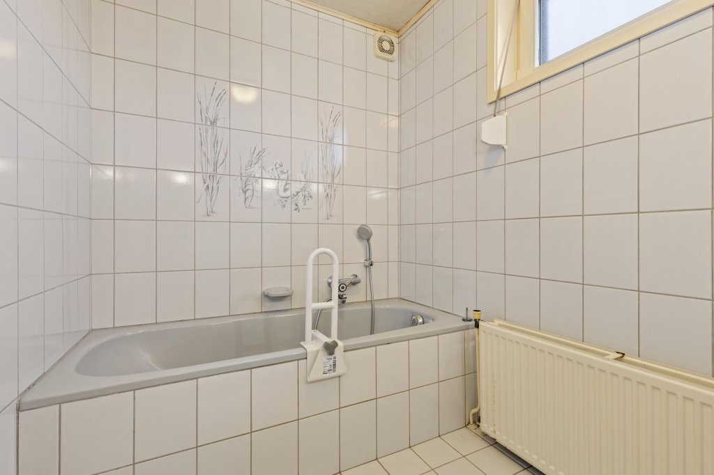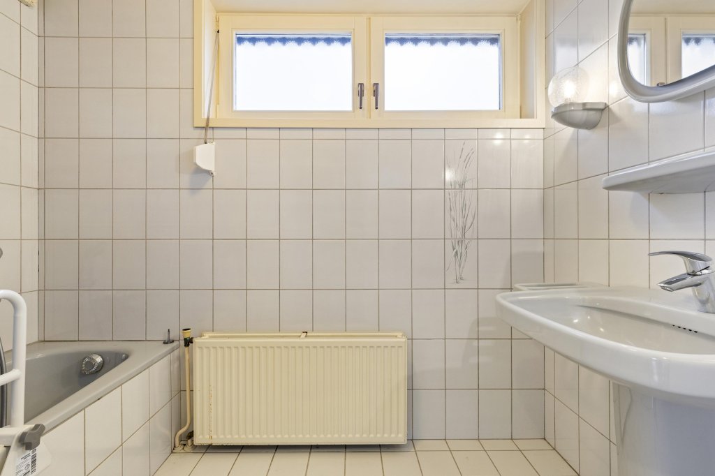 Geheel betegelde badkamer (2.54 x 1.68 m) welke voorzien is van een ligbad en een wastafel.