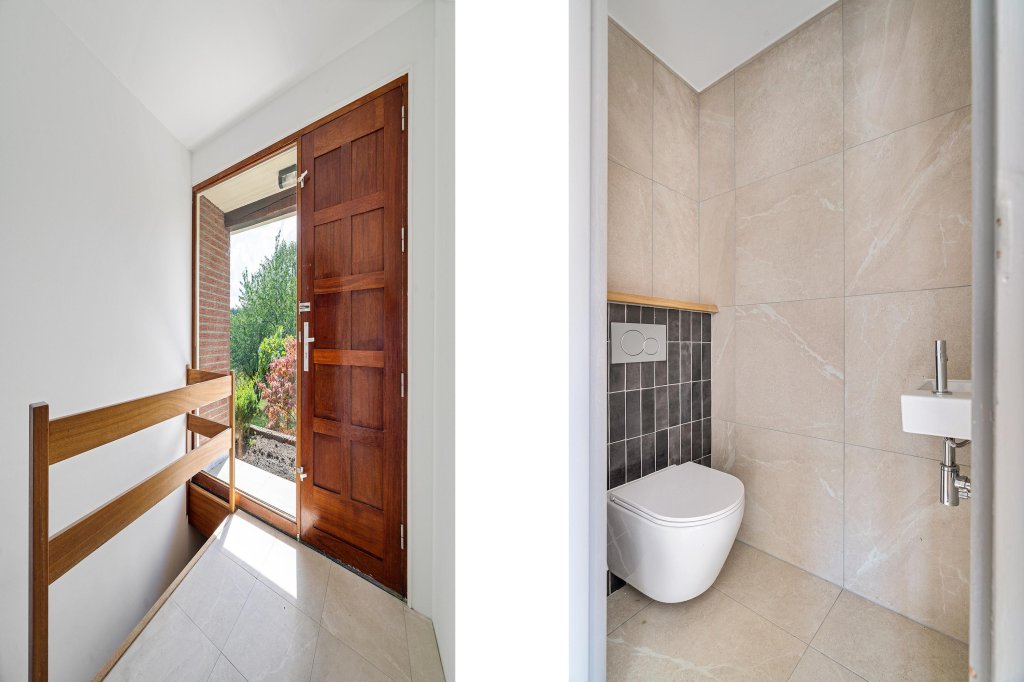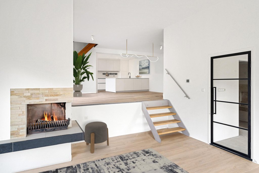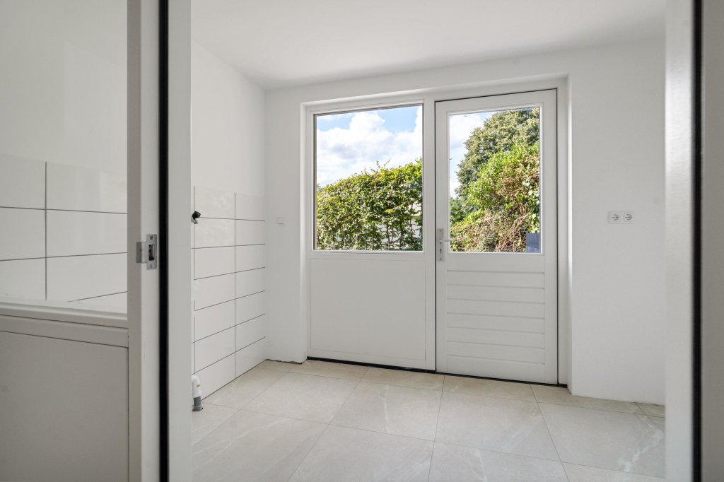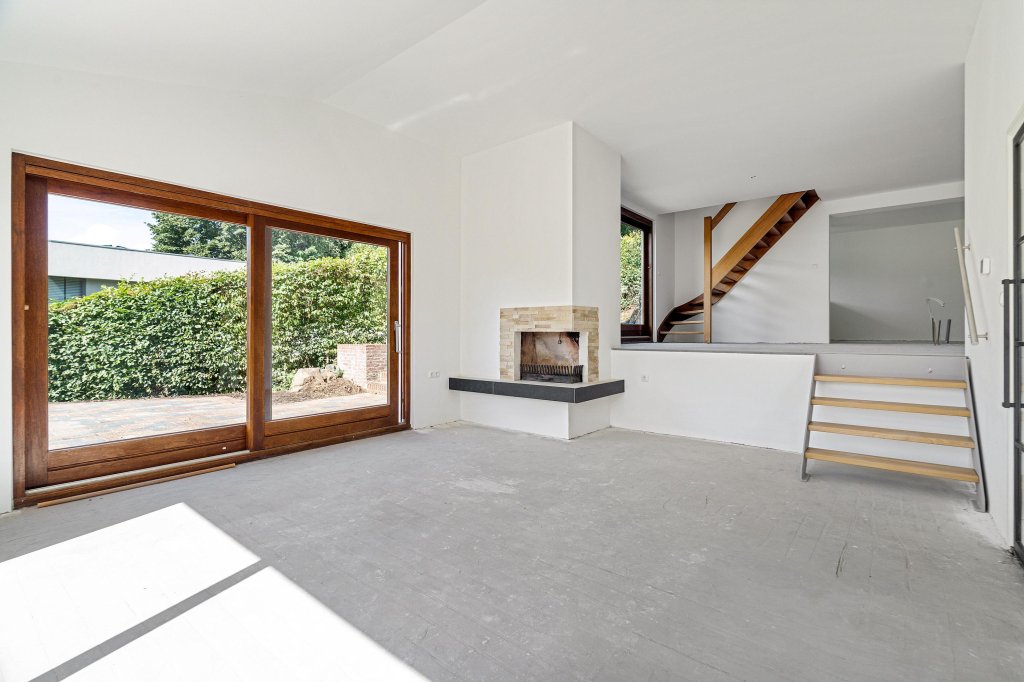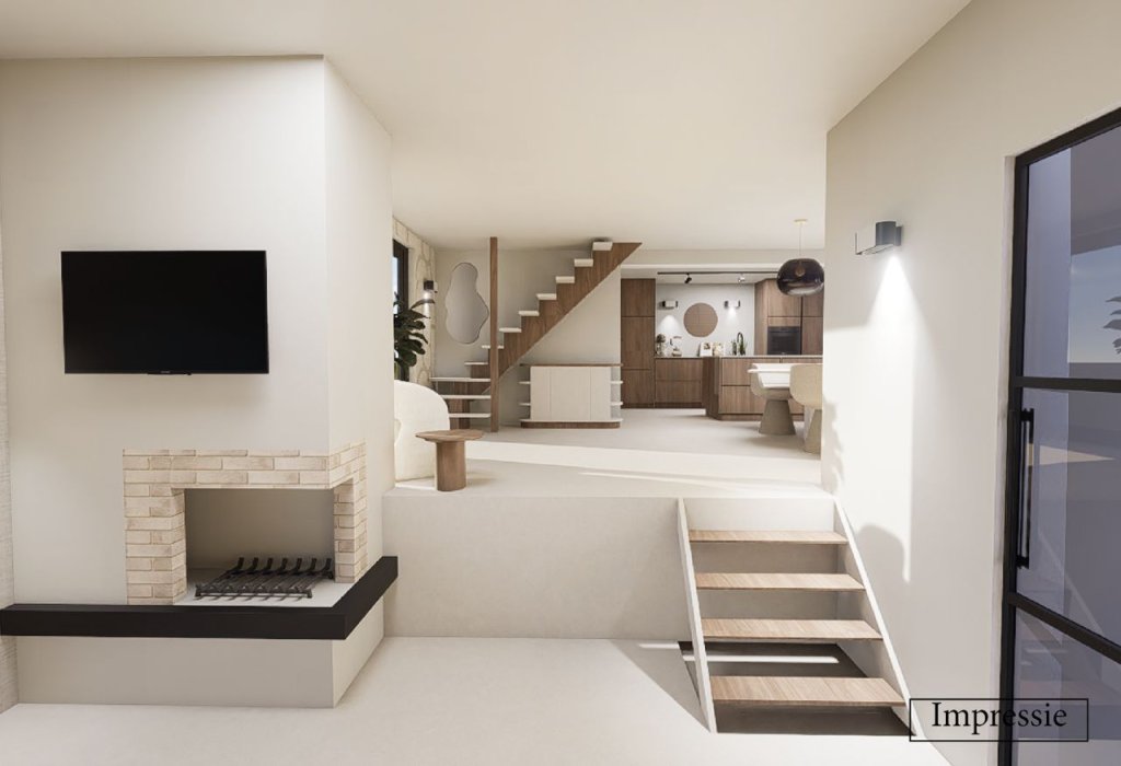 Entree/hal met tegelvloer, moderne toiletruimte(2025), meterkast, garderobe en toegang tot de woonkamer. De woonkamer heeft veel lichtinval, een prachtig uitzicht over het groen en een open haard. Via een speelse splitlevel indeling is de open keukenruimte te bereiken. De keuken dient nog geplaatst te worden. Aansluitend aan de keuken is de bijkeuken te vinden met toegang tot de tuin. Middels twee schuifpuien vanuit de splitlevel woonkamer is de opnieuw aangelegde zijtuin toegankelijk.