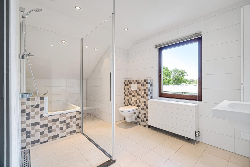 De moderne badkamer is voorzien van inloopdouche, ligbad, toilet, wastafel met meubel en elektrische vloerverwarming.