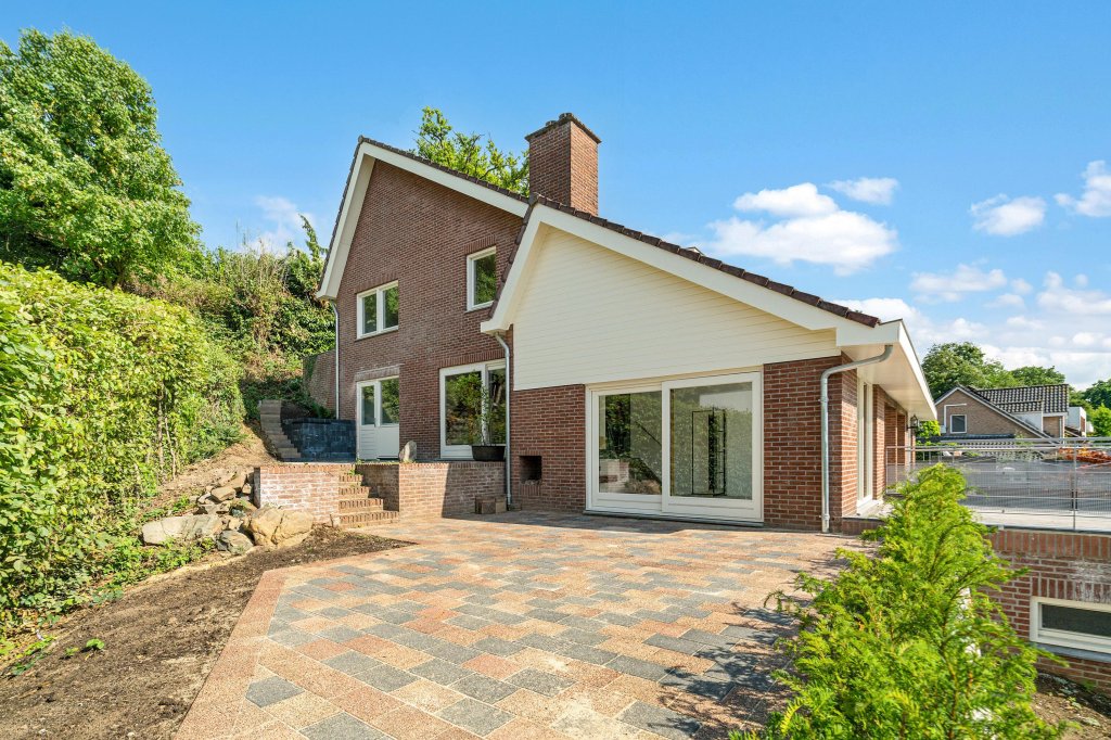 In de voortuin is een riante oprit gecreëerd voor vier auto’s, is onderhoudsvriendelijk afgewerkt en heeft een ruim zonneterras met prachtig uitzicht over het natuurgebied. De zijtuin is voorzien van een speelse indeling met twee terrassen, buitenhaard en opnieuw aangelegde borders.