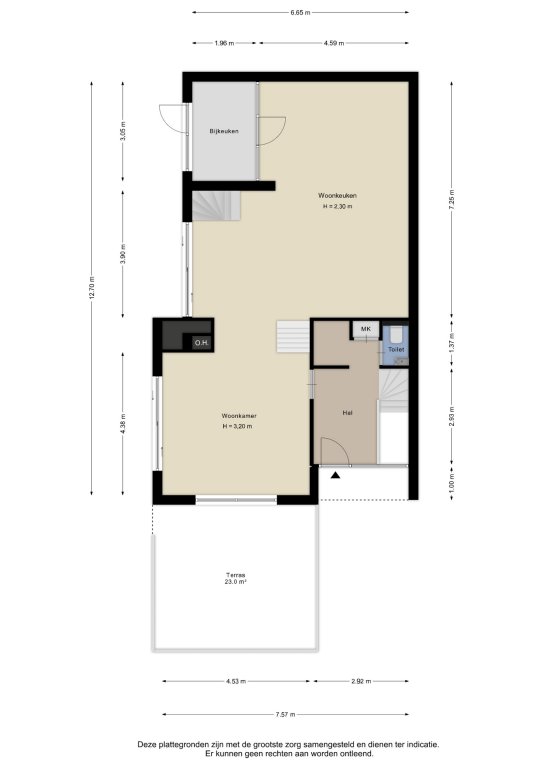 Alle door ons kantoor verstrekte informatie omtrent onroerende zaken, moet beschouwd worden als een uitnodiging om in onderhandeling te treden, en is geheel vrijblijvend! Alle vermelde maten en afmetingen zijn slechts bij benadering. Aan deze beperkte informatie kunnen geen rechten worden ontleend. Indien in enige documentatie of op enige website informatie staat die niet overeen komt met de werkelijkheid, dan geldt de feitelijke situatie waarin de woning zich bevindt, zoals koper deze tijdens de bezichtiging heeft kunnen waarnemen, en wordt de woning in deze feitelijke situatie/staat verkocht. Een (eventueel) bijgevoegde plattegrond dient uitsluitend als globale indicatie/visualisatie. Hieraan kunnen uitdrukkelijk geen rechten worden ontleend.