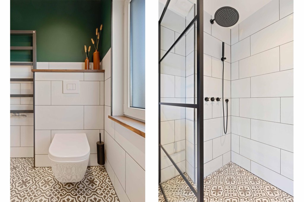 Netjes afgewerkte toiletruimte met hangend toilet en fonteintje.