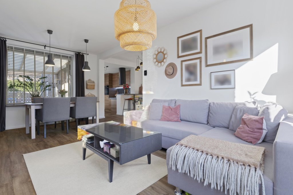 Ruime L-vormige woonkamer met laminaatvloer en sfeervol glas-in-loodraam, wat zorgt voor een warme uitstraling.