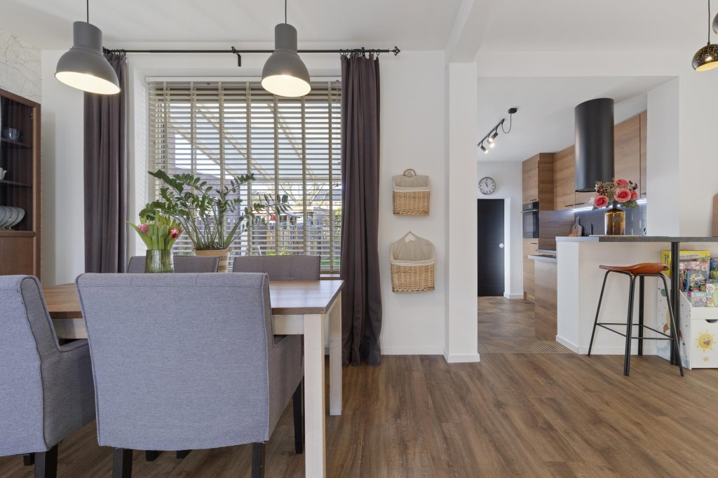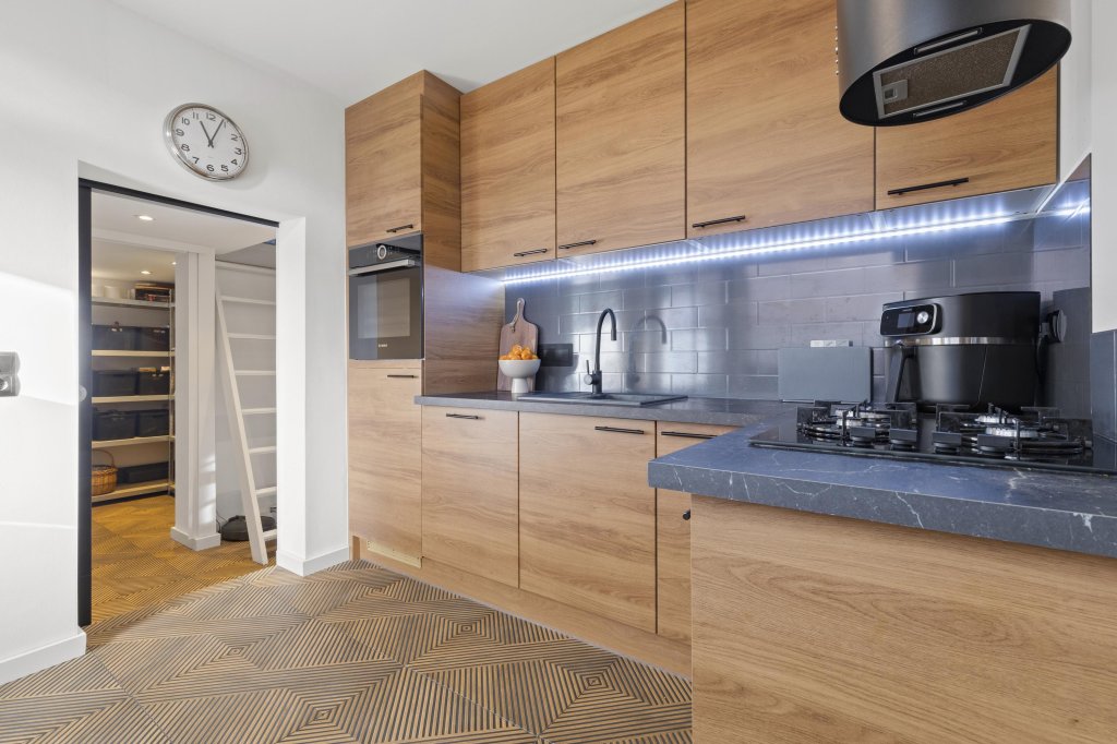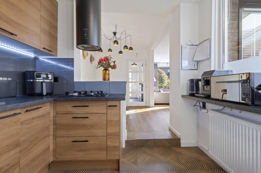 Lager gelegen moderne semi-open keuken met stijlvolle houtlook tegelvloer, uitgevoerd in een praktische L-opstelling en voorzien van inbouwapparatuur zoals een 4-pits gaskookplaat met afzuigkap, vaatwasser, combioven. In de keuken is wel ruimte voor het plaatsen van een koelkast.