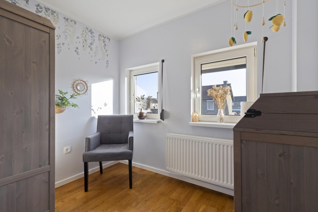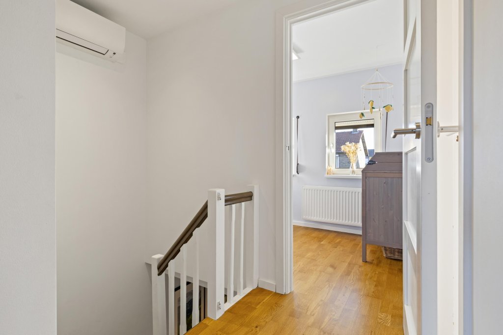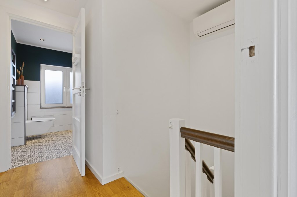 Aansluitend de bijkeuken met witgoedaansluitingen en een trap naar de multifunctionele vierde slaapkamer / werkkamer / speelkamer / hobbyruimte, voorzien van airco.