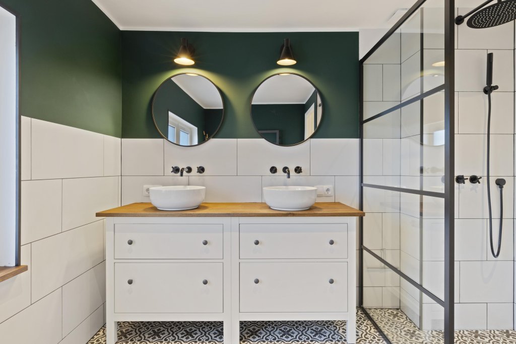 Luxe uitgevoerde badkamer met tweede toilet, royaal badmeubel met dubbele wastafel, grote inloopdouche en elektrische vloerverwarming.