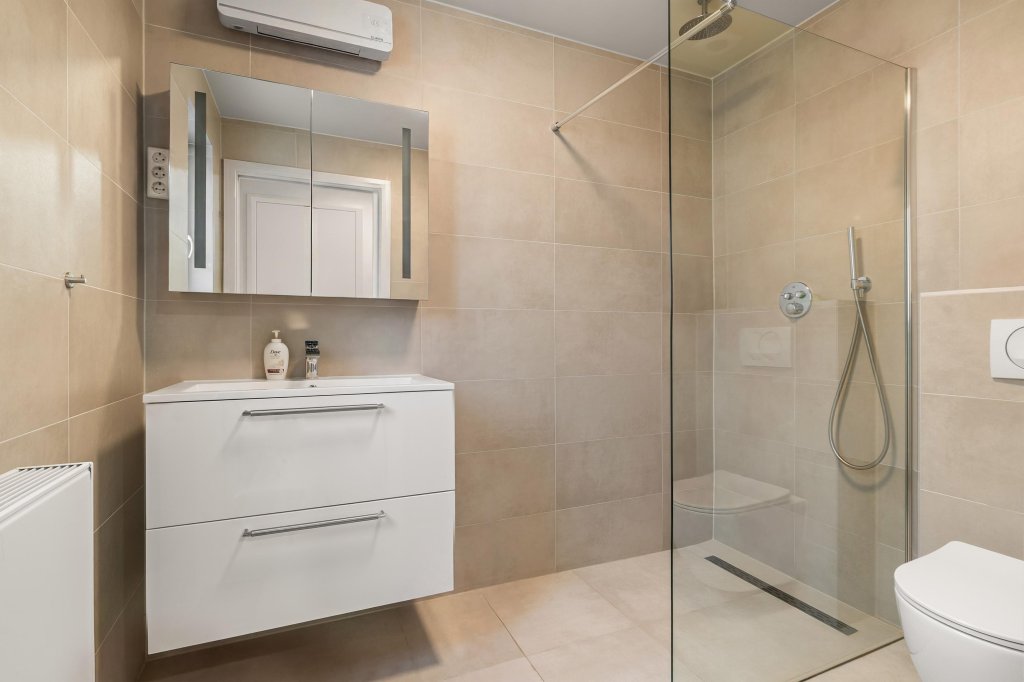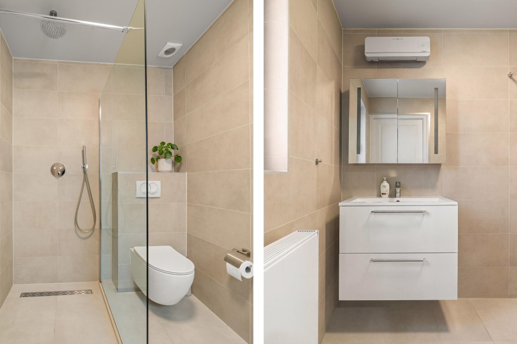 Via de entreehal met meterkast betreedt u een tussenruimte met toegang tot de eerste slaapkamer (ca. 13 m²) met inbouwkastenwand en de living. De woonkamer (met airco) voelt direct prettig aan en vormt samen met de eetkamer een fijne leefruimte. Vanuit de eetkamer is de patiotuin en de keuken te bereiken. De moderne keuken is uitgerust met een vaatwasser en magnetron. Achter de keuken bevindt zich de moderne badkamer met toilet, inloopdouche en wastafel met meubel. Vanuit de woonkamer is een doorloopkamer met inloopkast en de tweede slaapkamer (ca. 21 m²) bereikbaar.