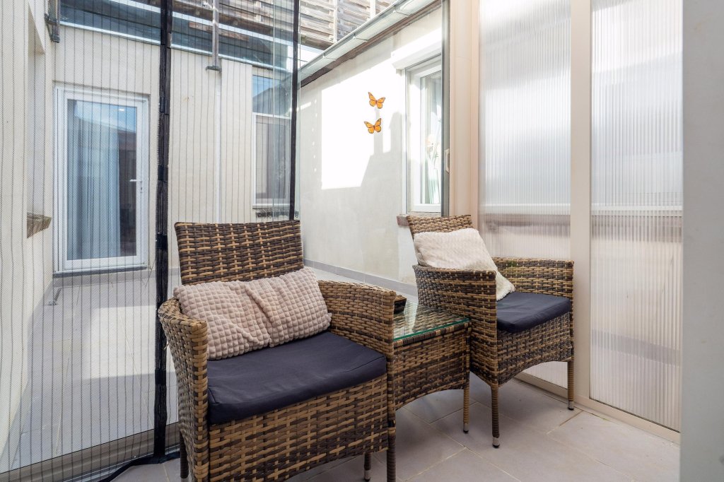 Middenin het appartement vindt u een praktische patiotuin van ca. 15 m² met een kleine overkapping. Vanuit de tuin is de achtergelegen hobby-/kantoorruimte bereikbaar.