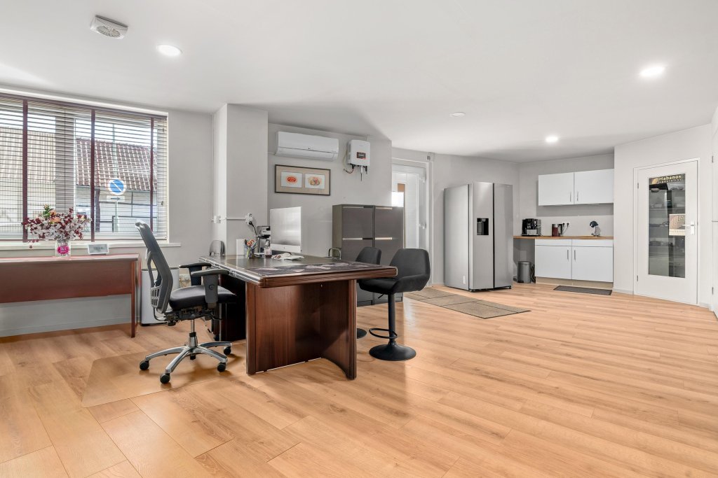 Aan de achterzijde via en tussenportaal is een ruime hobby- / kantoorruimte gecreëerd welke beschikt over een eigen ingang, toiletruimte en keukenblok.