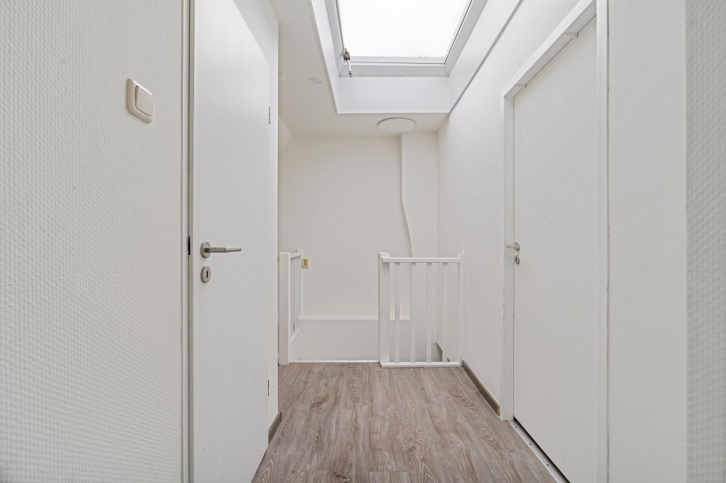 Via de vaste trap bereik je de overloop, waar een grote openslaande lichtkoepel voor aangename natuurlijke verlichting zorgt. Vanuit hier heb je toegang tot twee slaapkamers en de cv-ruimte. Beide slaapkamers zijn voorzien van een laminaatvloer en een dakraam, wat zorgt voor een lichte en frisse uitstraling.