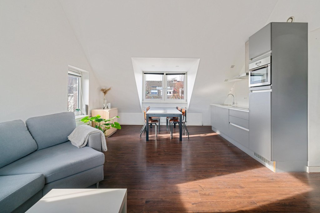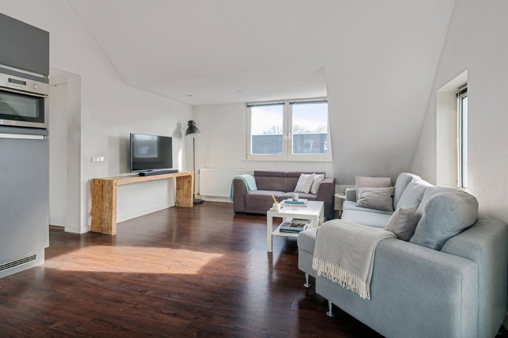 Via de gezamenlijke entree en de karakteristieke trapopgang bereikt u het appartement. De hal geeft toegang tot de lichte woonkamer, die is afgewerkt met een nette laminaatvloer. Dankzij de prettige raampartijen geniet de ruimte van een aangename lichtinval, wat zorgt voor een open en uitnodigende sfeer.