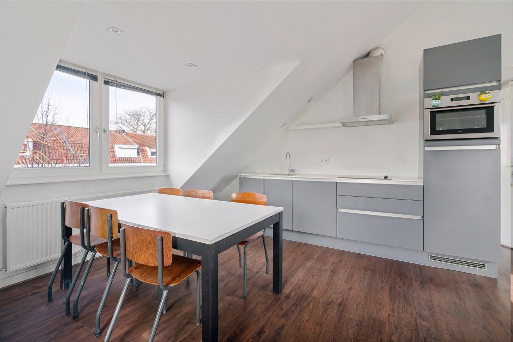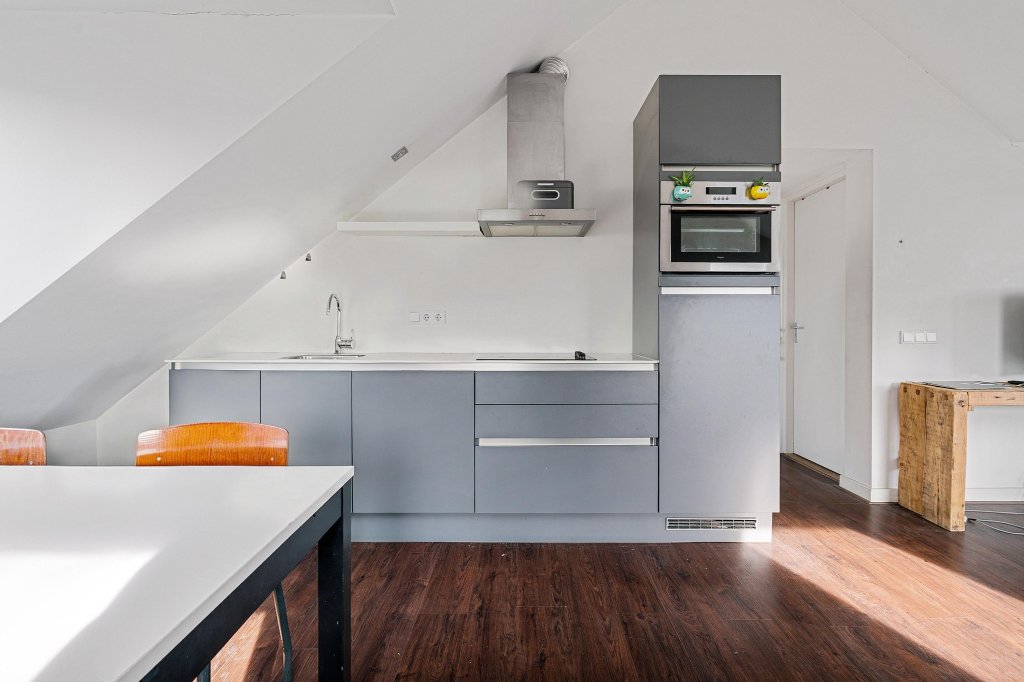 De open keuken is uitgevoerd in een rechte opstelling en voorzien van een combimagnetron, spoelbak, inductiekookplaat en afzuigkap. De keuken is efficiënt ingericht en sluit logisch aan op het woongedeelte, waardoor koken en wonen op een natuurlijke manier samenkomen.