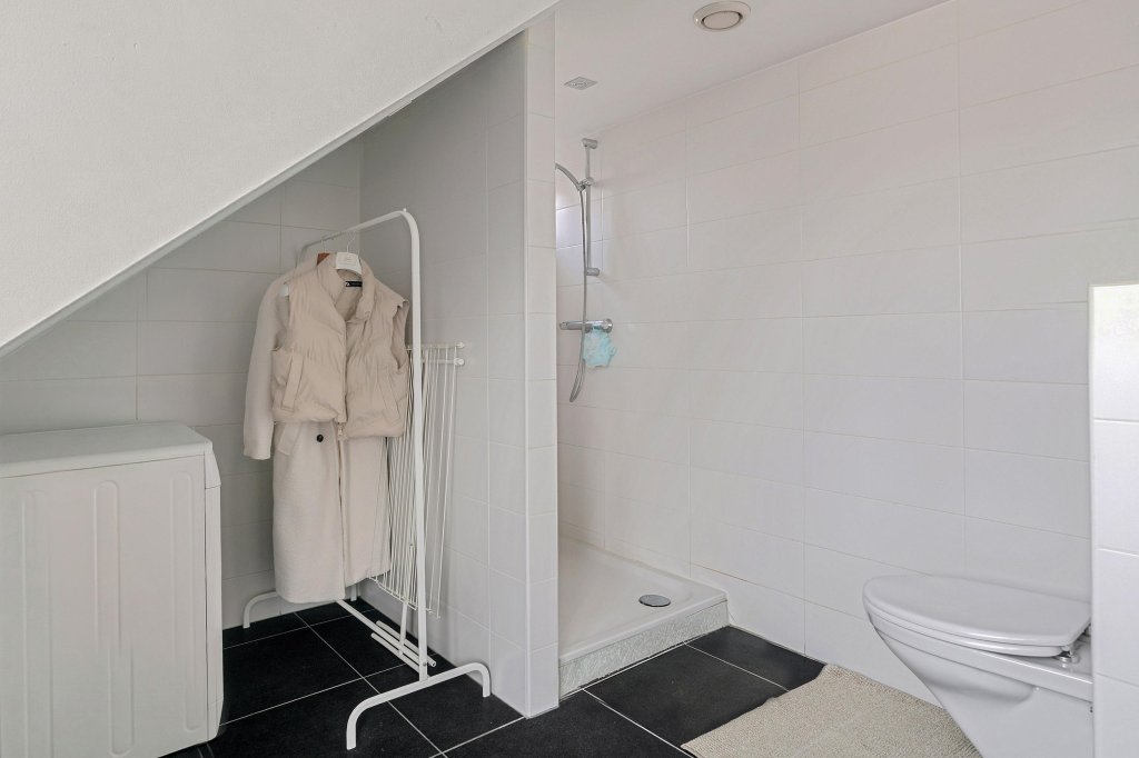De volledig betegelde, moderne badkamer is verzorgd afgewerkt en uitgerust met een dubbele wastafel met ombouw, een inloopdouche, een toilet en aansluiting wasautomaat