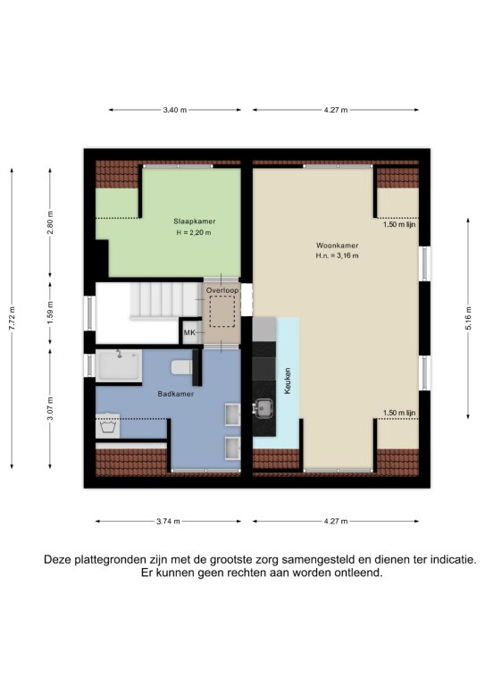 Alle door ons kantoor verstrekte informatie omtrent onroerende zaken, moet beschouwd worden als een uitnodiging om in onderhandeling te treden, en is geheel vrijblijvend! Alle vermelde maten en afmetingen zijn slechts bij benadering. Aan deze beperkte info kunnen geen rechten worden ontleend. Indien in enige documentatie of op enige website informatie staat die niet overeen komt met de werkelijkheid, dan geldt de feitelijke situatie waarin de woning zich bevindt, zoals koper deze tijdens de bezichtiging heeft kunnen waarnemen, en wordt de woning in deze feitelijke situatie/staat verkocht. Een (eventueel) bijgevoegde plattegrond dient uitsluitend als globale indicatie/visualisatie. Hieraan kunnen uitdrukkelijk geen rechten worden ontleend.