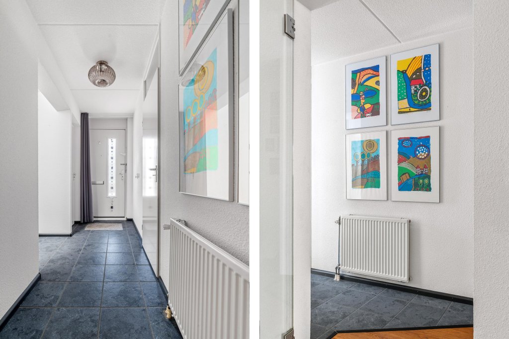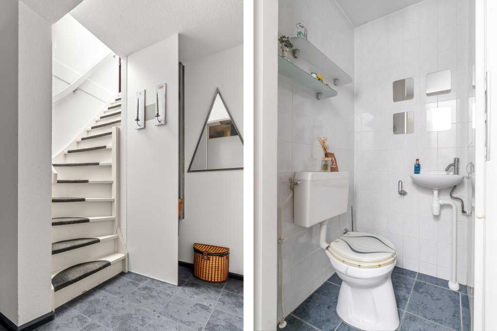 Via de entree betreedt u een royale, betegelde hal in stijlvolle antraciettinten. Hier bevinden zich de meterkast, een volledig betegelde toiletruimte met fonteintje en de trap naar de eerste verdieping.