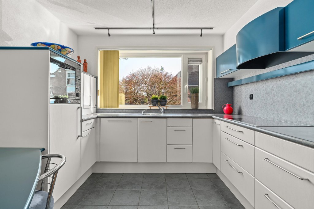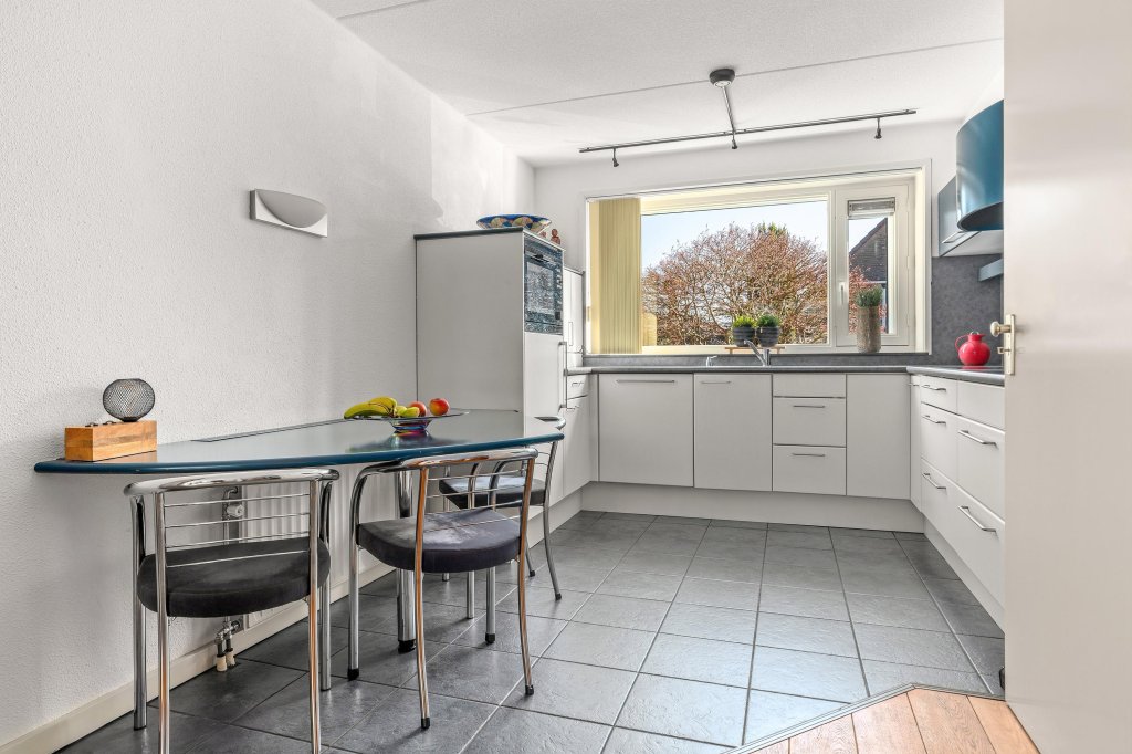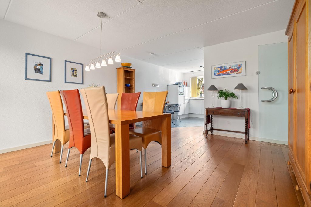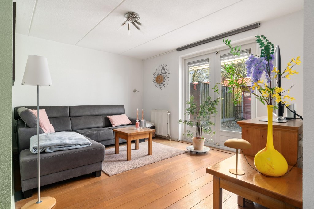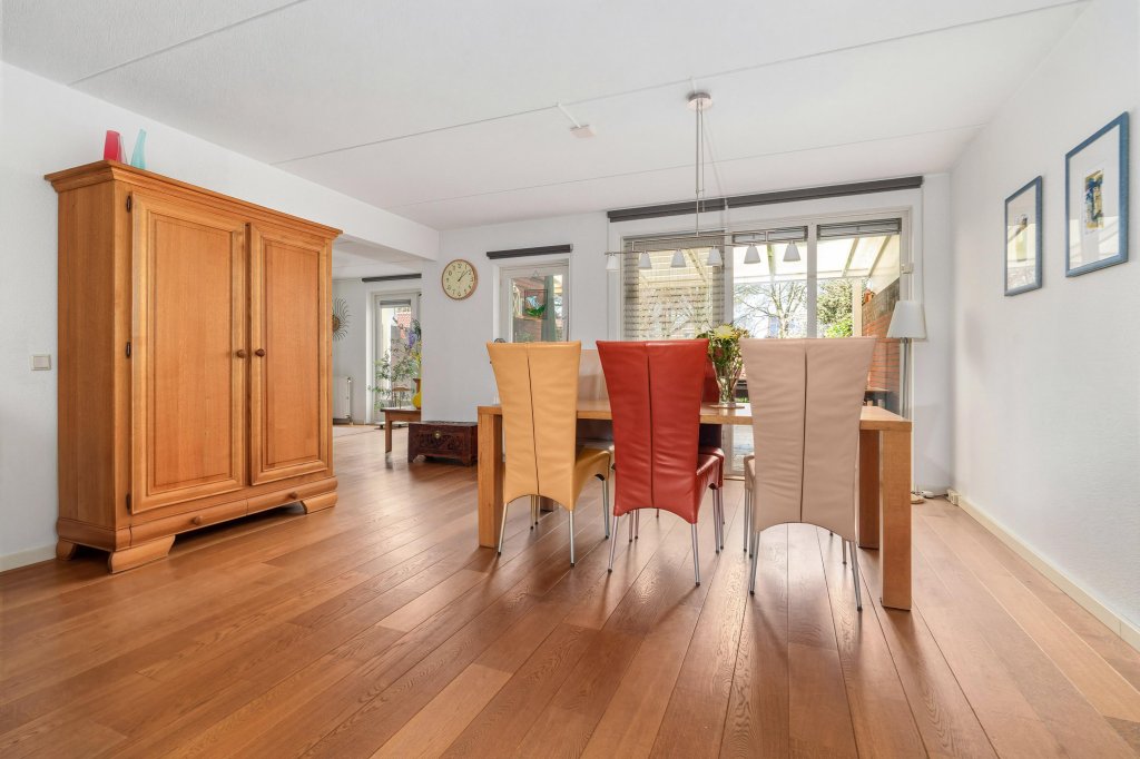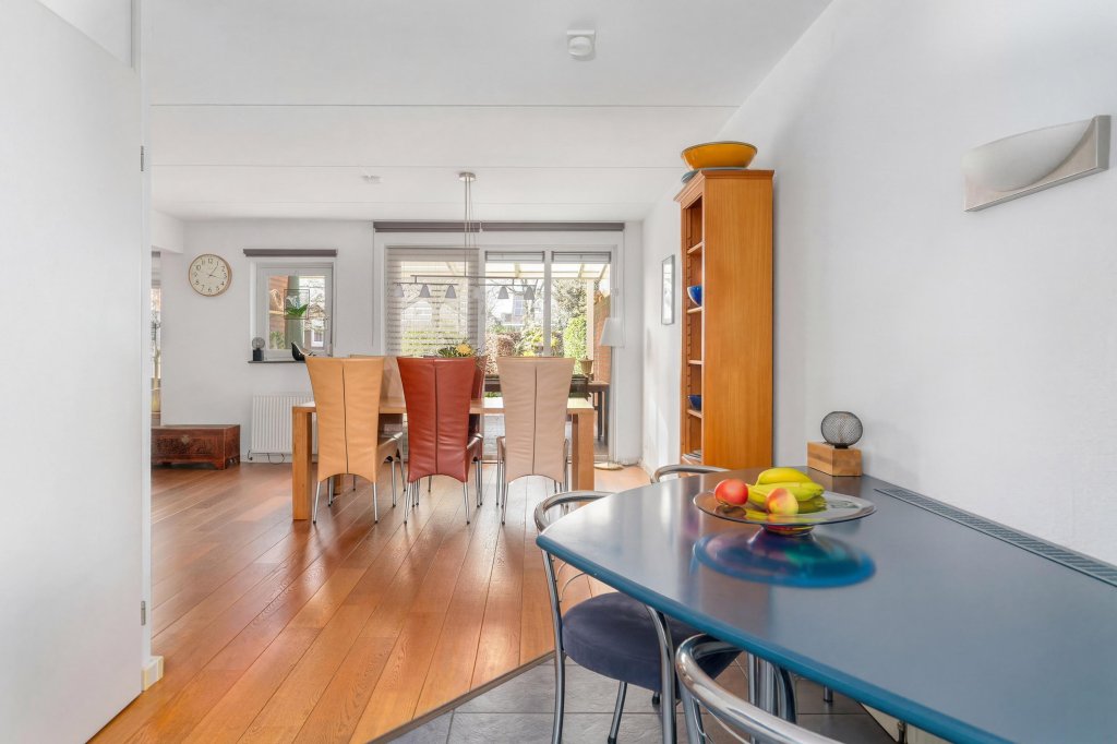 De lichte en sfeervolle woonkamer met eetgedeelte is voorzien van een parketvloer en biedt direct toegang tot de achtertuin. De open keuken in hoekopstelling is compleet uitgerust met diverse inbouwapparatuur, waaronder een oven/magnetron, inductiekookplaat, afzuigkap en koelkast. Via de keuken is de praktische trapkast te bereiken.