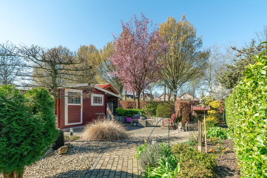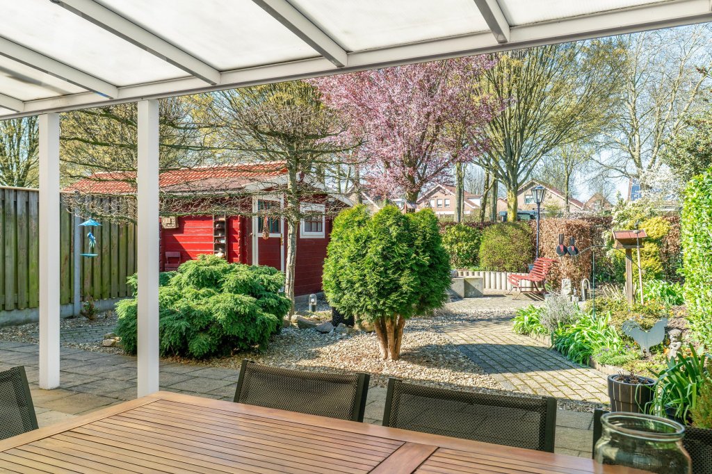 De achtertuin is netjes aangelegd en biedt volop privacy. Onder de ruime overkapping kunt u heerlijk ontspannen en genieten van het buitenleven. Daarnaast is er een tuinhuis aanwezig voor extra bergruimte.