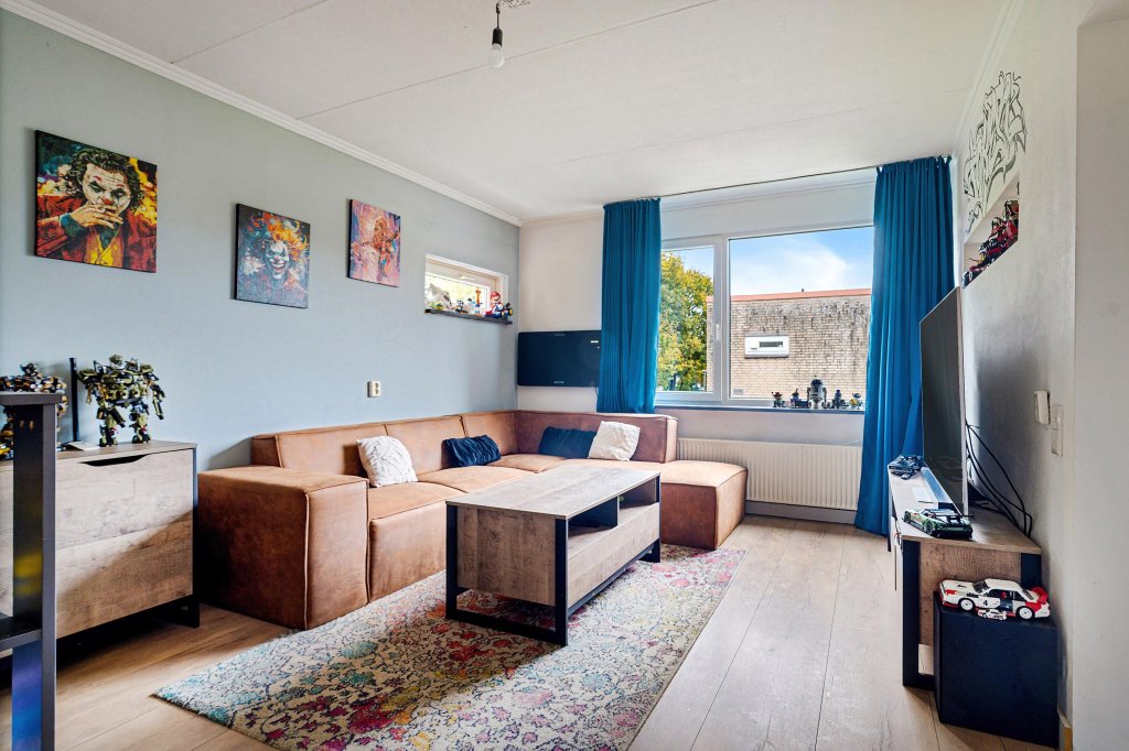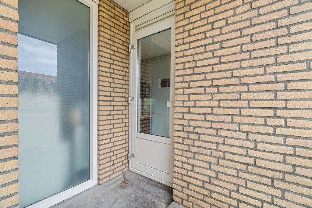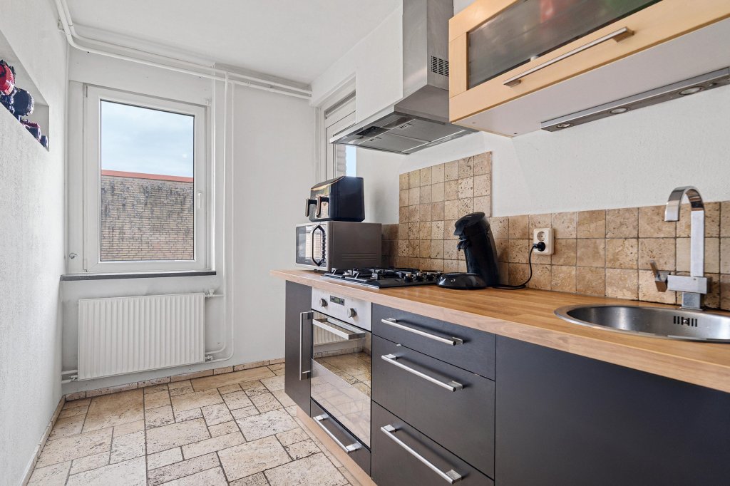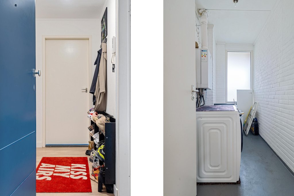 Hal / entree van het appartement met toegang tot de bijkeuken, slaapkamer 1, modern toilet met hangcloset en fontein en de woonkamer. De bijkeuken is voorzien van alle witgoedaansluitingen en standplaats cv-installatie (eigendom, 2021). De woonkamer is ingedeeld met zit- en eetgedeelte en toegang tot slaapkamer 2. De halfopen keuken met rechte opstelling is voorzien van de navolgende apparatuur: koelkast, diepvries, 4-pits gaskookplaat, afzuigkap en oven. Middels loopdeur is het balkon bereikbaar.