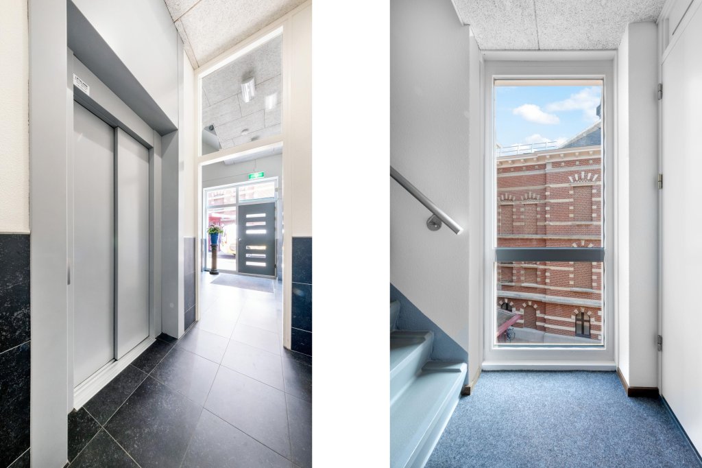 Gemeenschappelijke ontvangsthal met trap en lift voor toegang tot de verdiepingen.