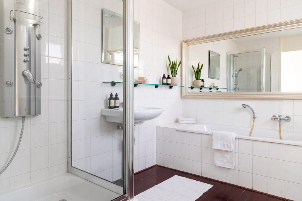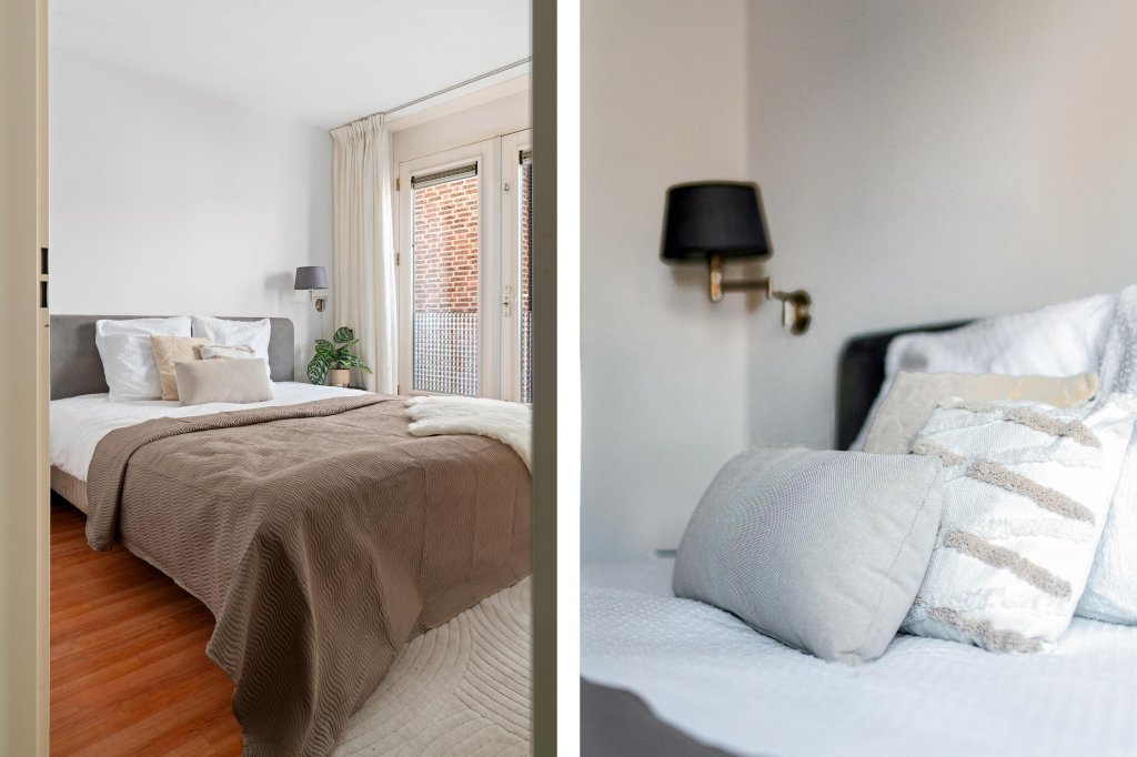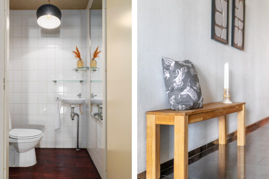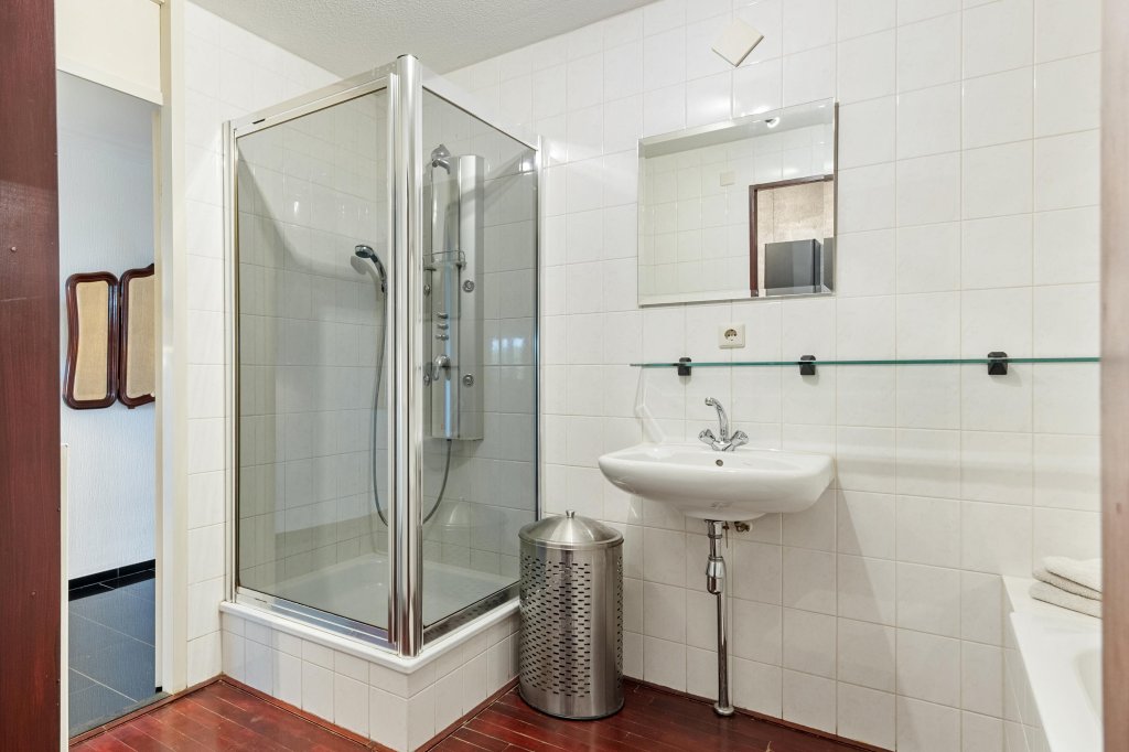 Verder beschikt het appartement over een ruime slaapkamer met een laminaatvloer en een volledig betegelde badkamer, uitgerust met een douche, ligbad en wastafel. Daarnaast is er een separate opbergruimte met aansluitingen voor wasapparatuur en de CV-installatie. Het geheel betegelde toilet met fontein maakt het comfort compleet.