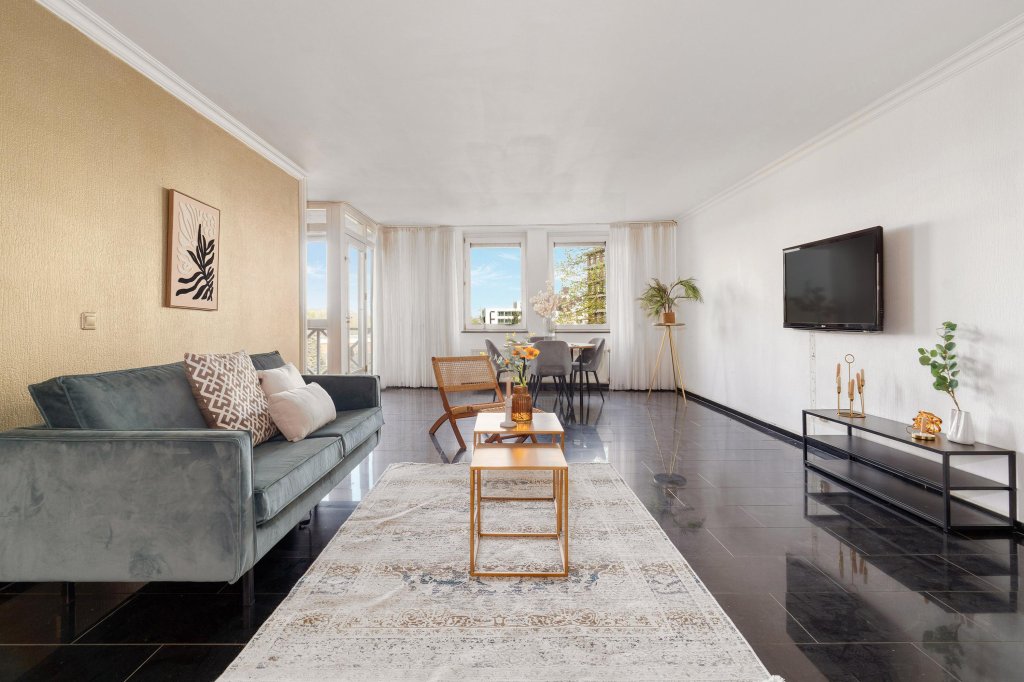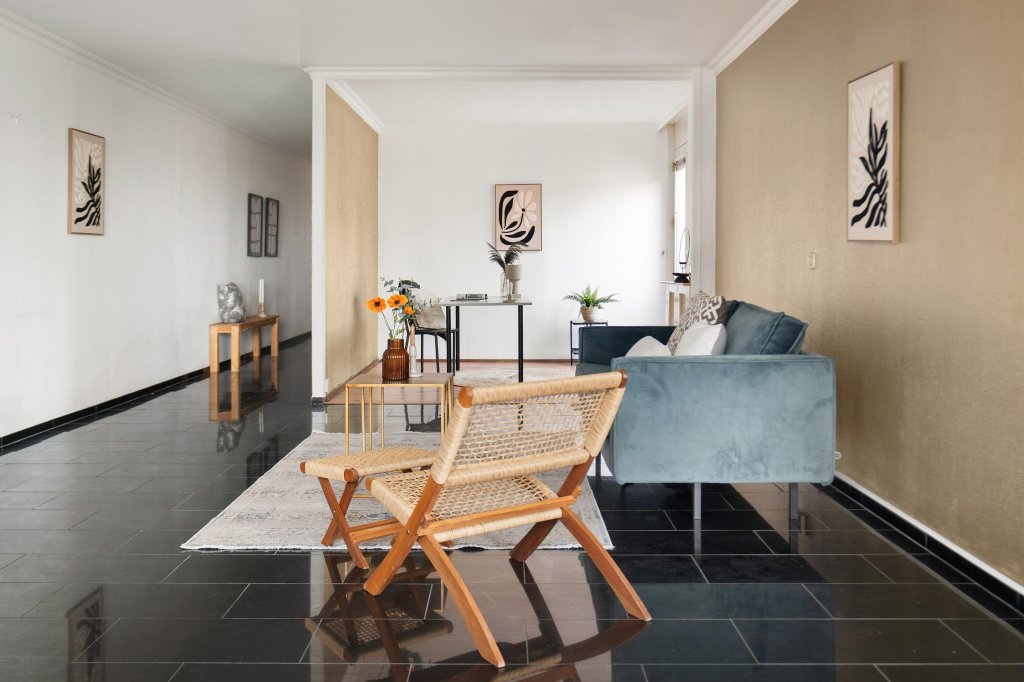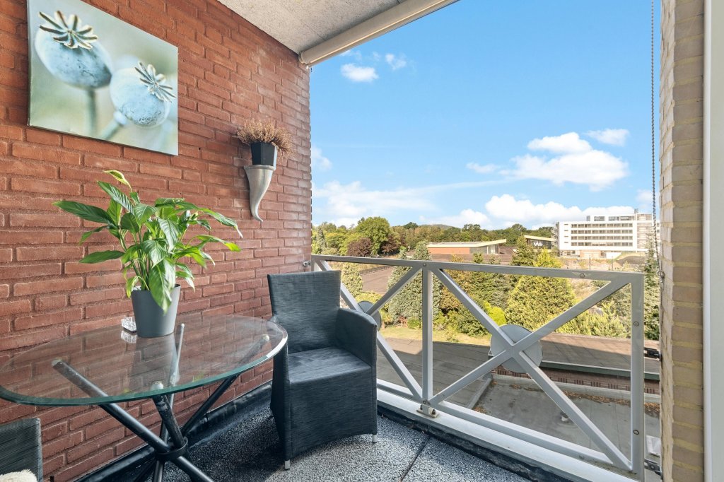 Via de hal met moderne meterkast en granietenvloer betreedt u de ruime woonkamer. De woonkamer, met veel natuurlijk lichtinval, is ingedeeld in een gezellige zitruimte en een eetgedeelte in de voormalige tweede slaapkamer. Vanuit de woonkamer heeft u toegang tot de gesloten keuken en het overdekte balkon, waar u heerlijk van de buitenlucht kunt genieten.