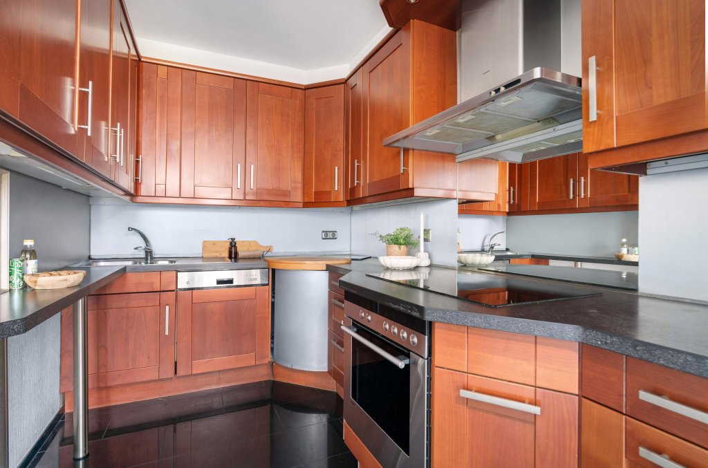 De keuken is modern en praktisch ingericht in een L-vormige opstelling en voorzien van hoogwaardige apparatuur, waaronder een 4-pits inductiekookplaat, vaatwasser, oven, koelkast met vriesvak en een roestvrijstalen afzuigkap.