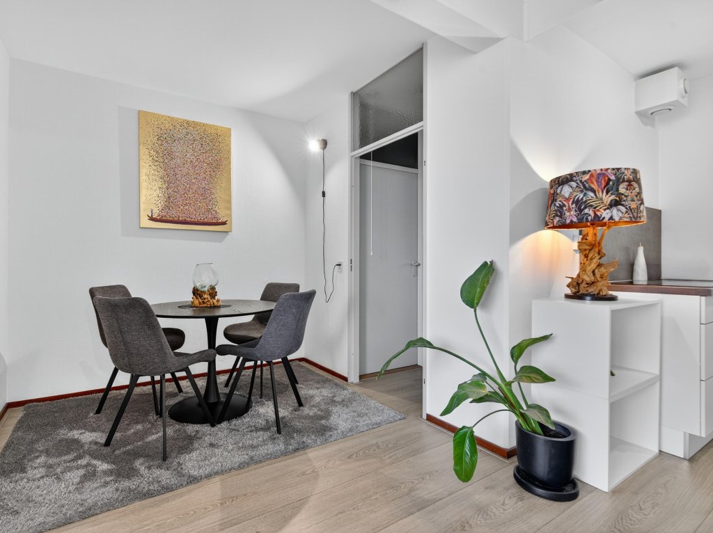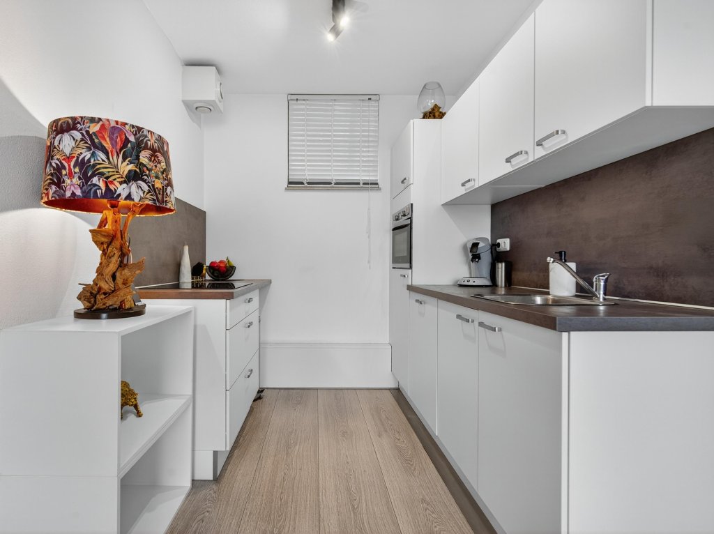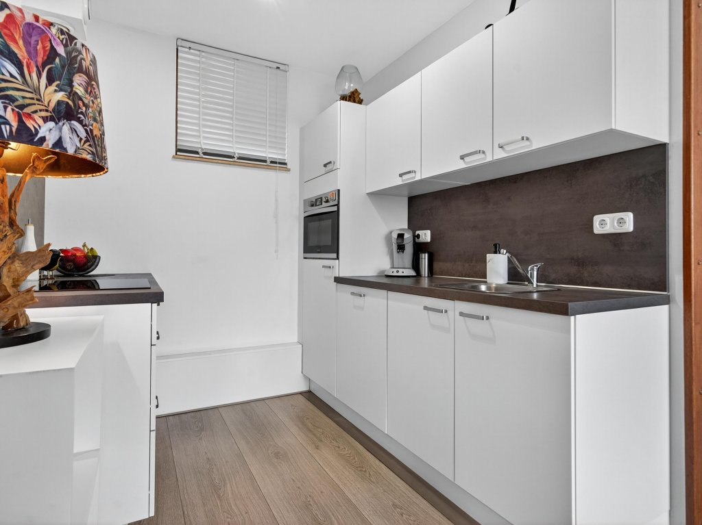 De keuken (vernieuwd in 2019) is voorzien van een moderne keukeninstallatie met vierpits inductiekookplaat, spoelbak, boven- en onderkasten, koelkast en combi magnetron-oven – praktisch en overzichtelijk ingericht.