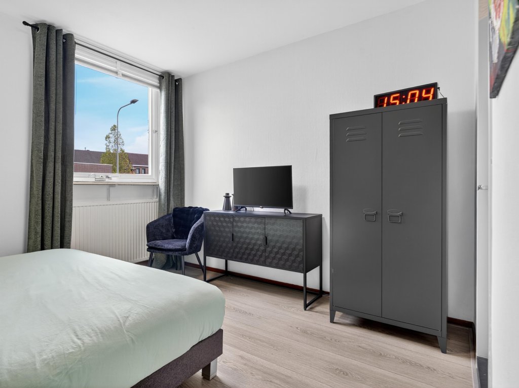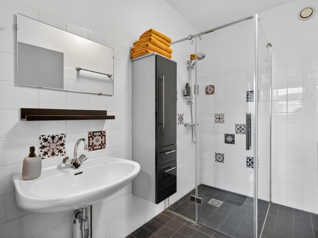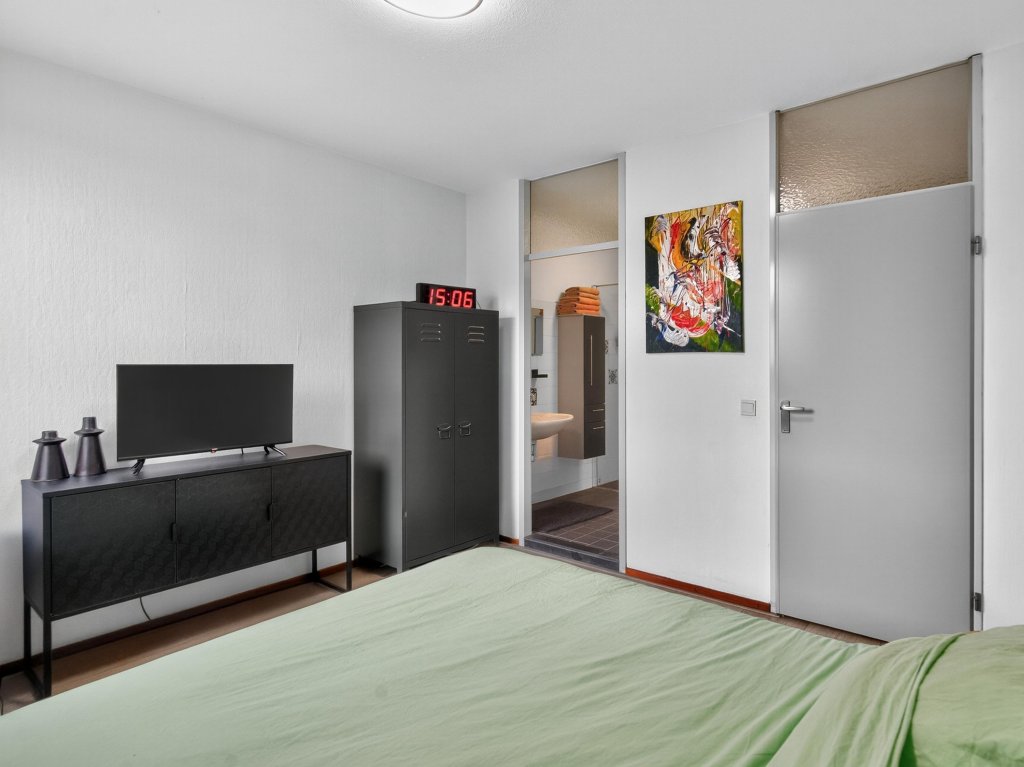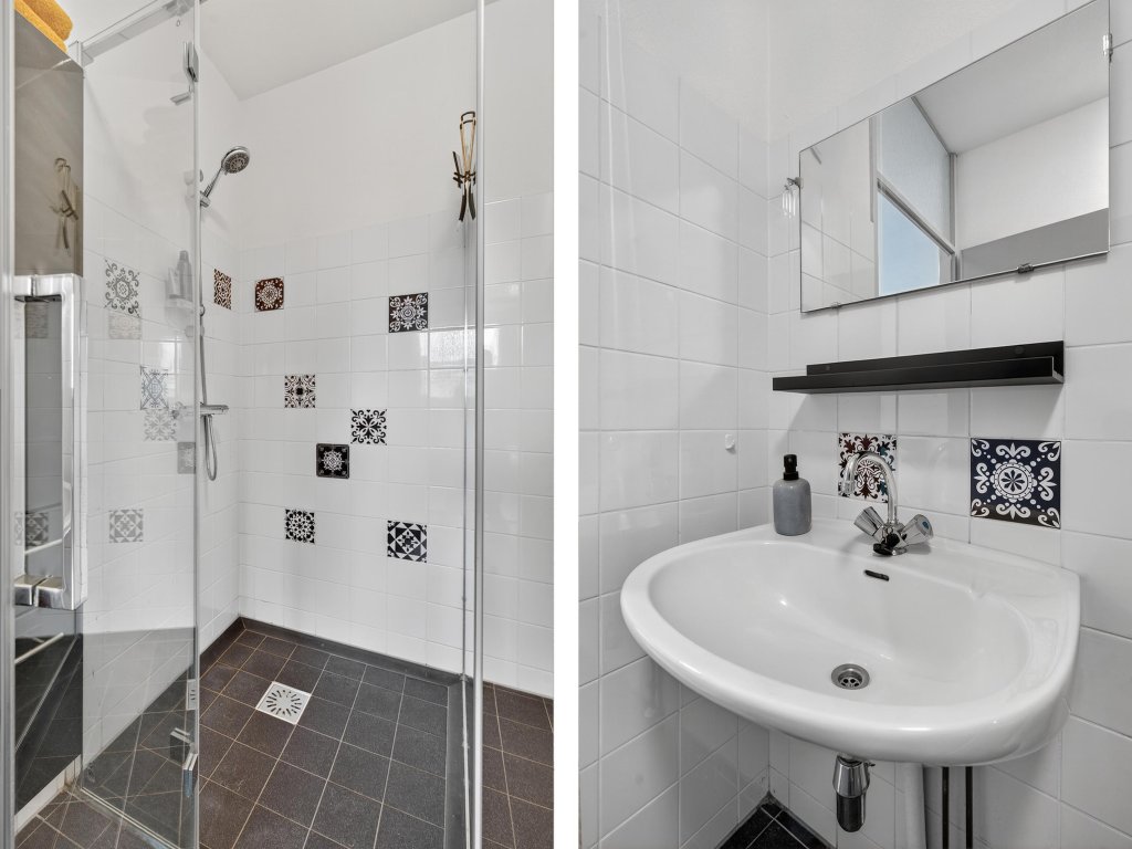 Het toilet is half betegeld en voorzien van een fonteintje. De slaapkamer is ruim en biedt rechtstreekse toegang tot de badkamer, die geheel is betegeld en voorzien van een inloopdouche en vaste wastafel.