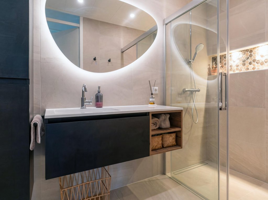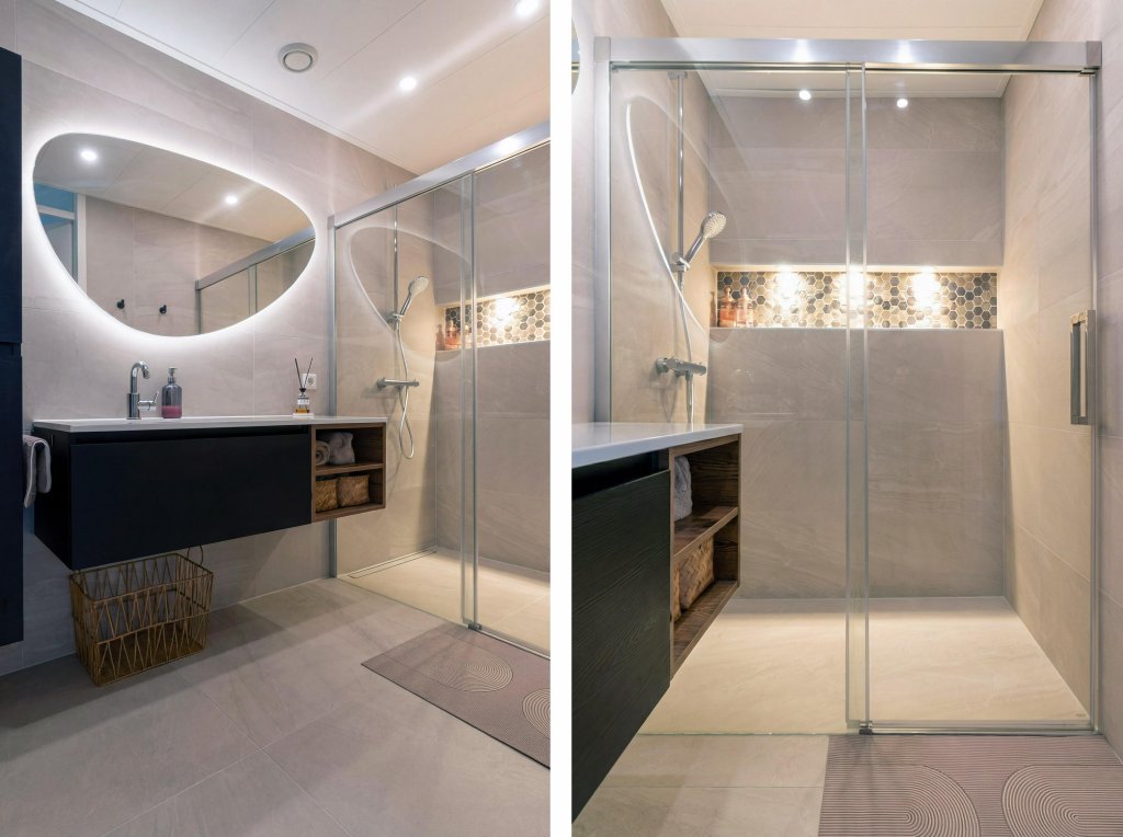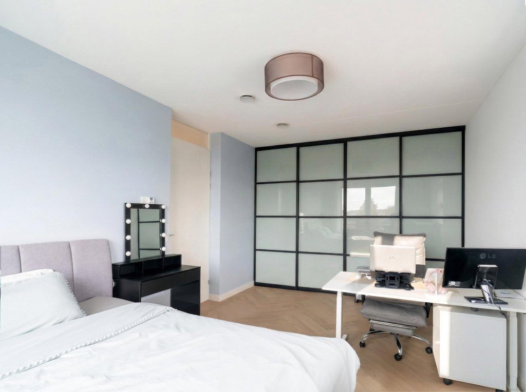 Het appartement beschikt over twee comfortabel bemeten slaapkamers, perfect als master bedroom en extra slaapkamer of thuiskantoor. De luxe badkamer is modern en volledig betegeld, voorzien van een ruime inloopdouche en een stijlvol wastafelmeubel.