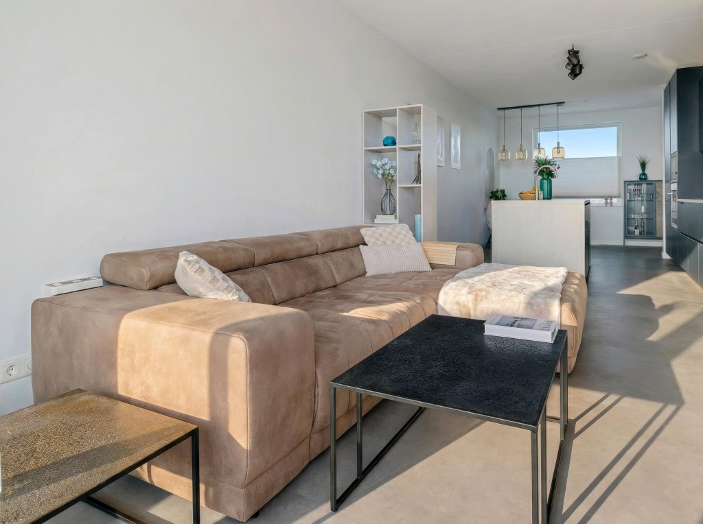 Bij binnenkomst valt direct de strakke en moderne afwerking op. De hal biedt toegang tot het zwevende toilet met fonteintje en de praktische wasruimte. De royale woon-/eetkamer vormt het hart van het appartement en is heerlijk licht dankzij de grote raampartijen. Centraal in de ruimte bevindt zich de exclusieve open keuken met kookeiland – een echte blikvanger. Deze is uitgerust met hoogwaardige inbouwapparatuur en nodigt uit tot koken, borrelen en tafelen in stijl. Via de woonkamer bereikt u het balkon aan de achterzijde: een fijne plek om in alle rust te genieten van een kop koffie in de ochtendzon of een ontspannen avond na een drukke dag.