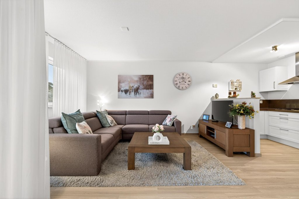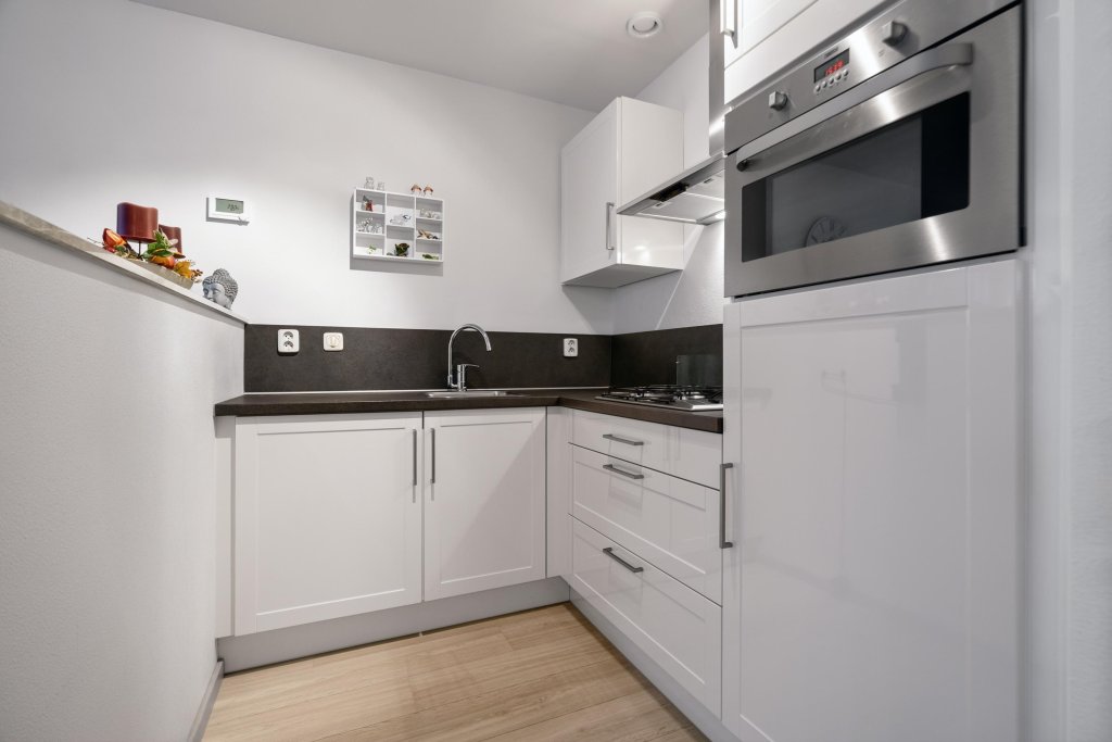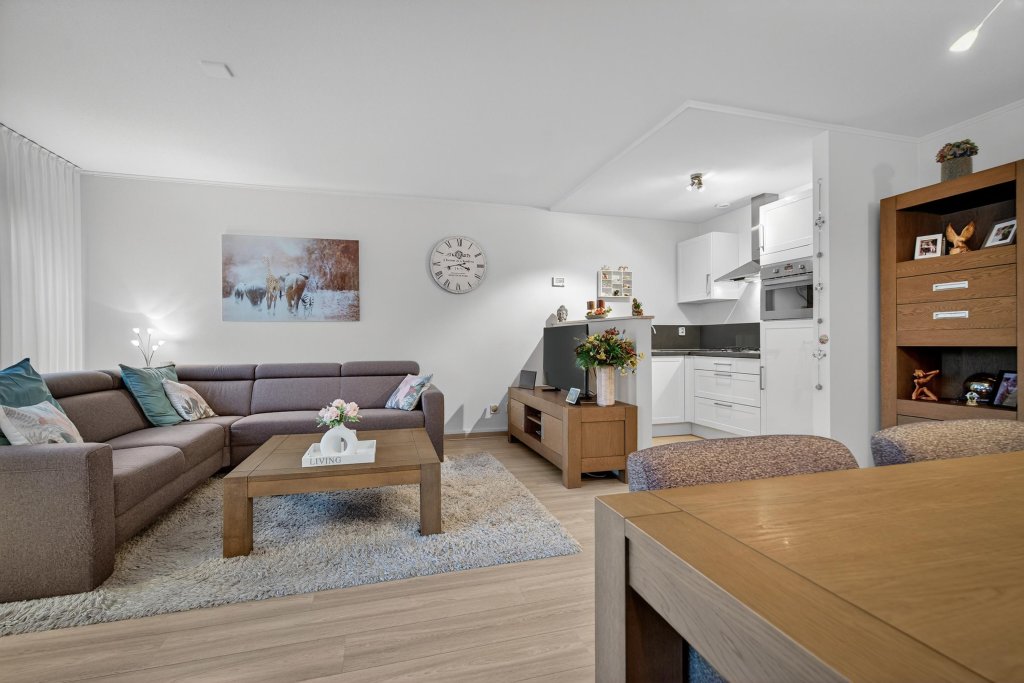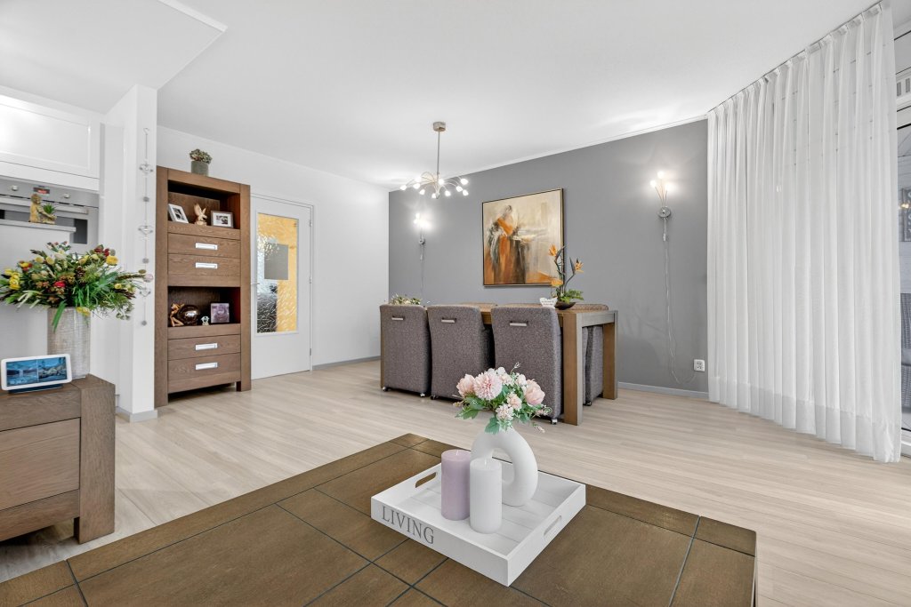Woonkamer met een laminaatvloer verdeeld in een open keuken en een zit- en eetgedeelte. De open keuken is voorzien van een nette installatie in hoekopstelling en heeft de navolgende apparatuur; 4-pits gaskookplaat, vaatwasser, koelkast met diepvries, afzuigkap en combi-oven.