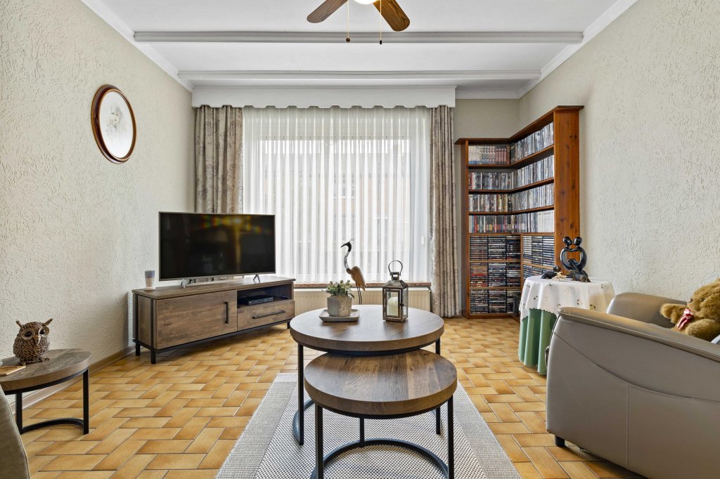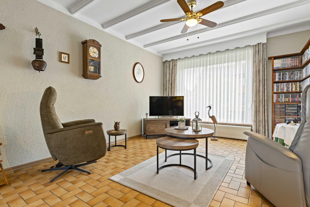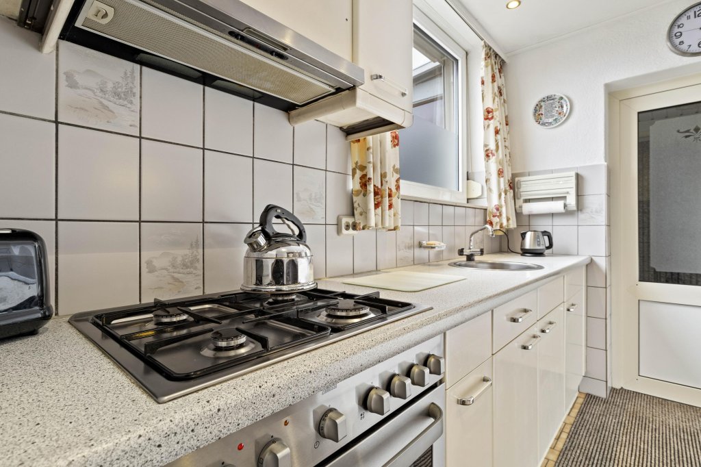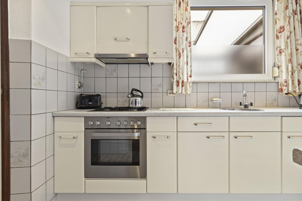 Woonkamer met tegelvloer en semi- open keuken voorzien van 4-pits gaskooktoestel, wasemkap en oven.