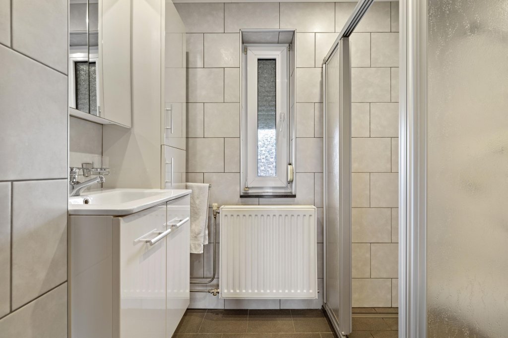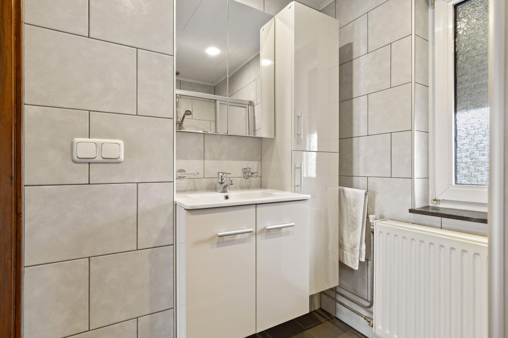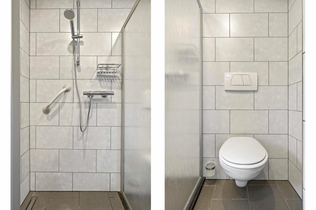 Geheel betegelde badkamer met douche, vaste wastafel met meubel en tweede toilet.