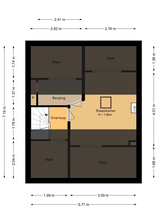 Middels vaste trap te bereiken zolderverdieping met overloop voorzien van bergkasten en vierde slaapkamer met