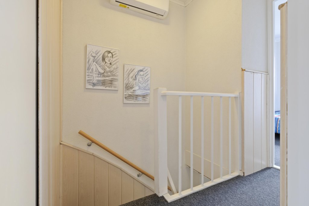 Overloop met toegang tot drie slaapkamers, allen voorzien van vloerbedekking. De compacte maar functionele badkamer beschikt over een douchecabine en een wastafel.
