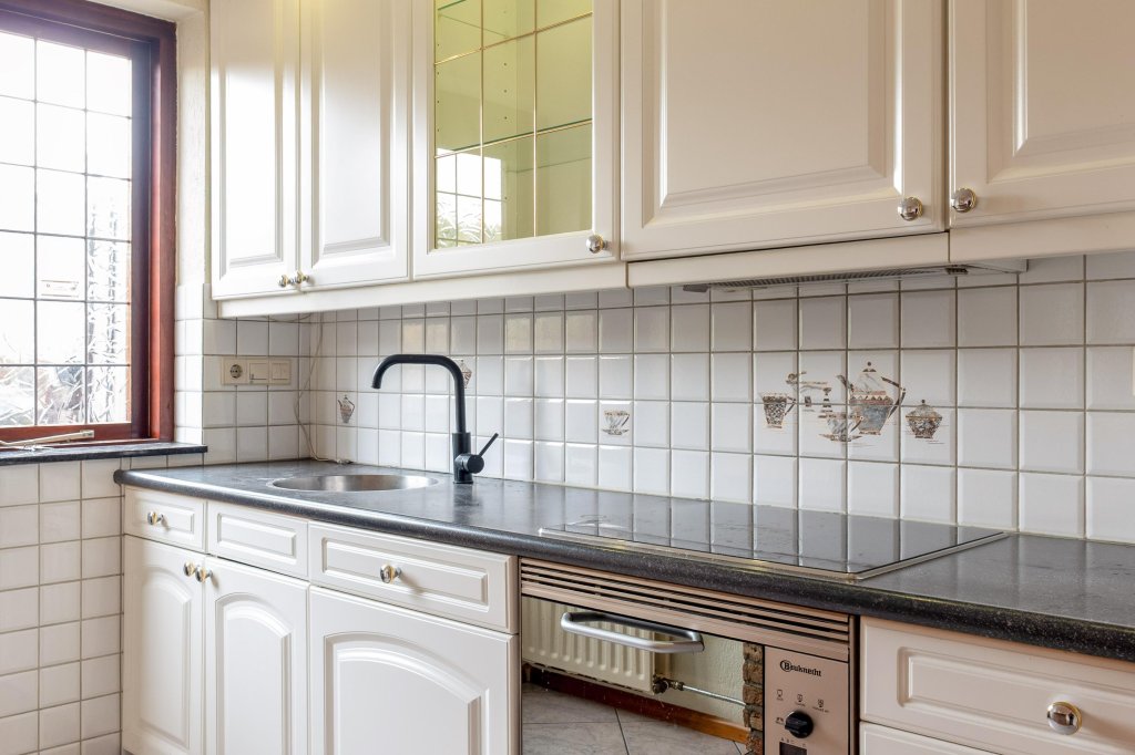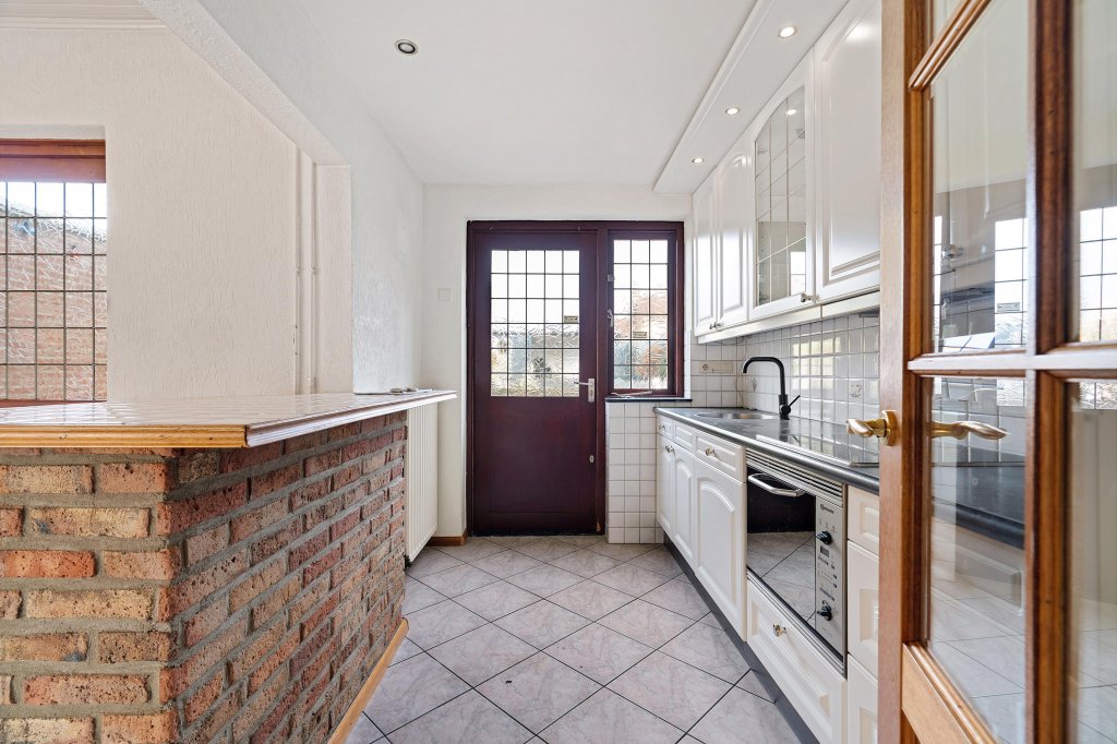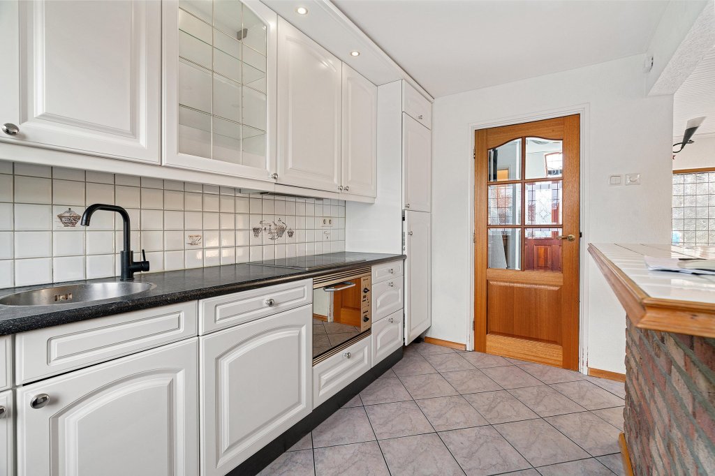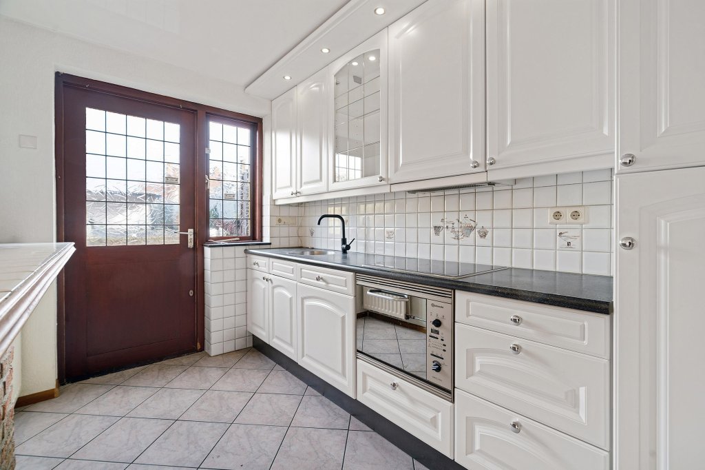 De semi-open keuken met tegelvloer is functioneel ingedeeld in een rechte opstelling en voorzien van een inductiekookplaat, afzuigkap, oven en koelkast. Vanuit de keuken is er directe toegang tot de tuin – perfect voor zomerse dagen.