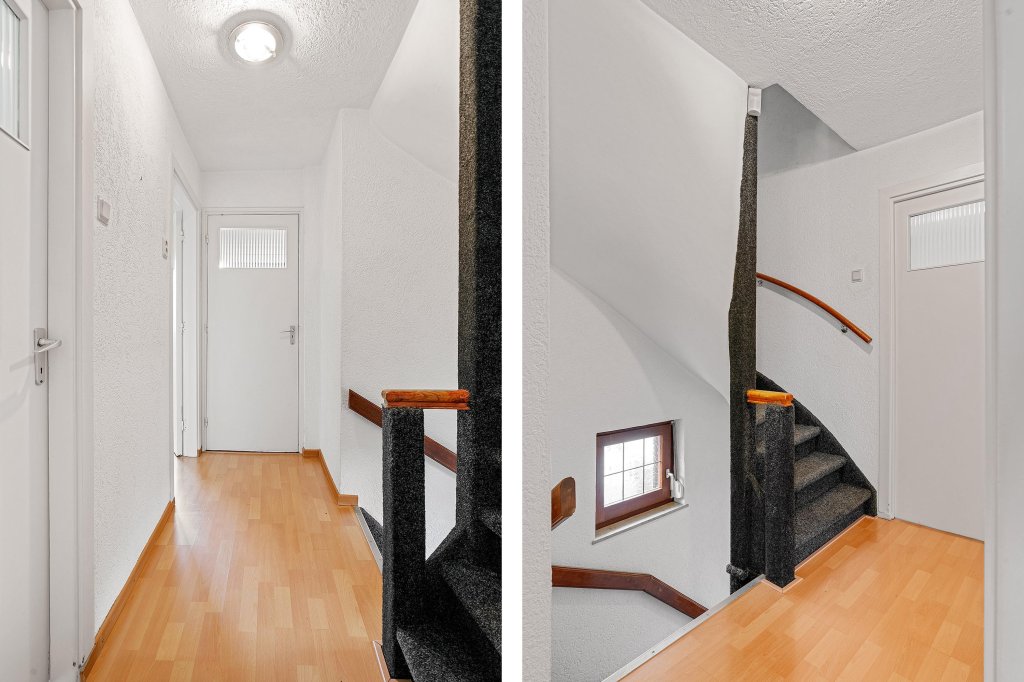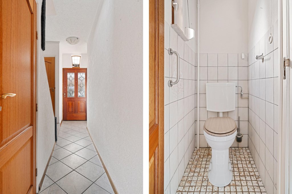 Via de entree kom je in de hal met meterkast en trapopgang naar de eerste verdieping. Hier bevindt zich tevens de deels betegelde toiletruimte met staand toilet.