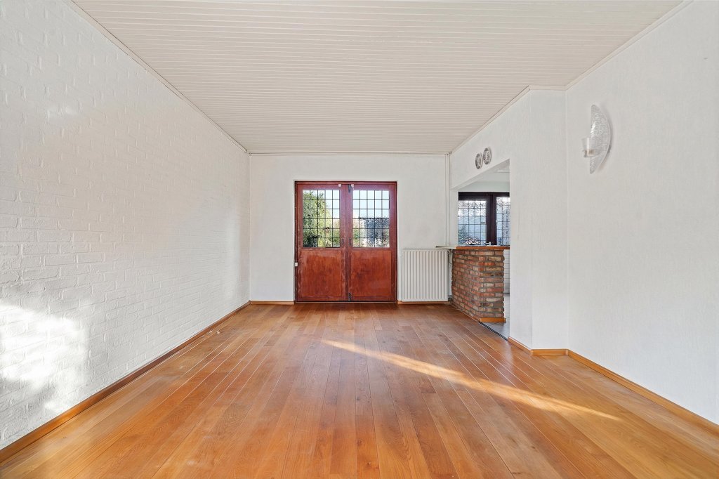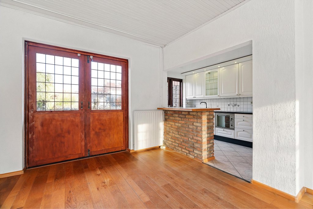 Aansluitend bevindt zich de woonkamer met parketvloer en openslaande deuren naar de tuin. Dankzij deze tuindeuren geniet je van veel lichtinval en een prettige verbinding tussen binnen en buiten. Een fijne leefruimte waar je comfortabel kunt ontspannen of gasten kunt ontvangen.