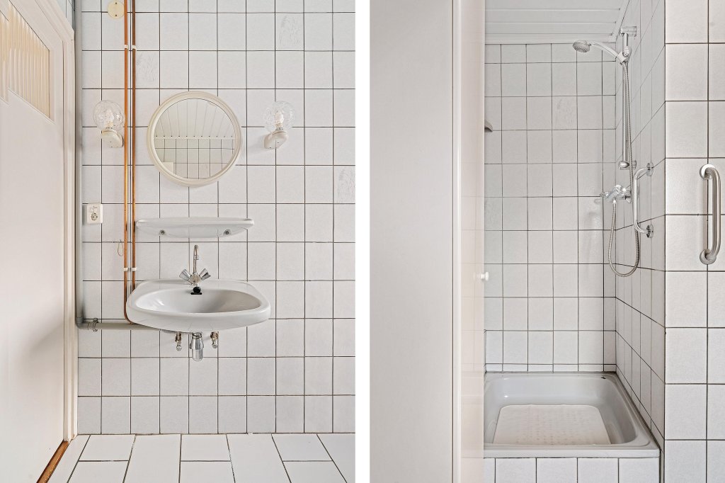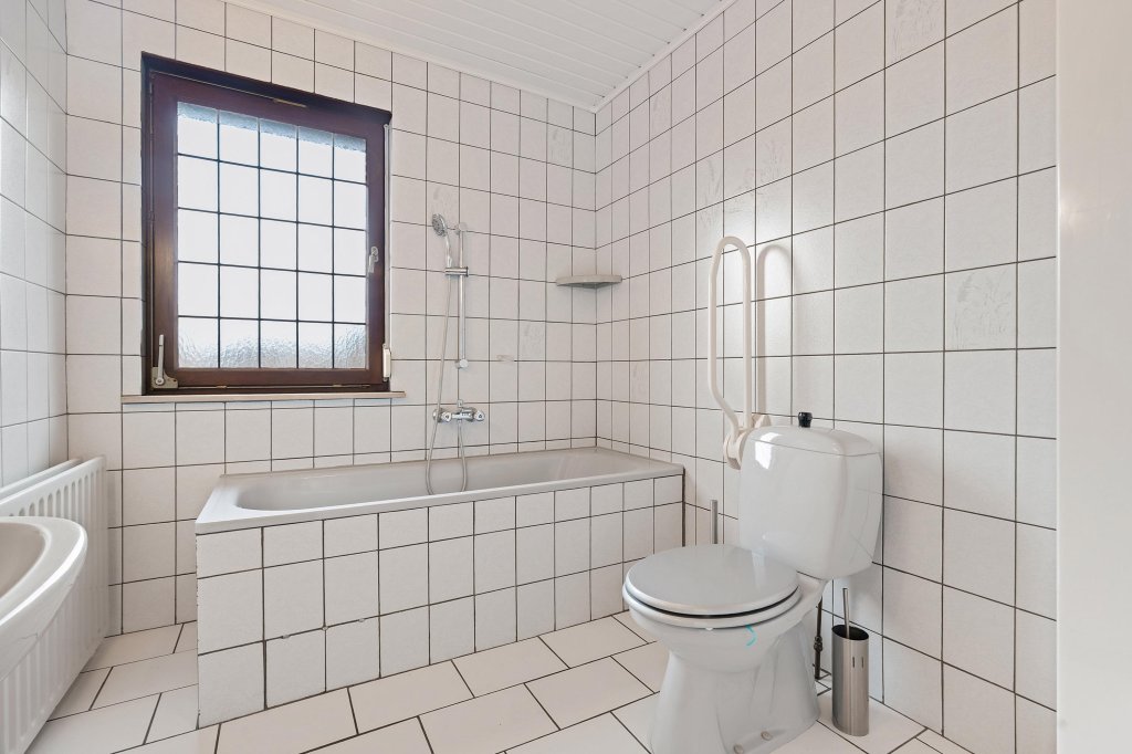 De geheel betegelde badkamer is compleet uitgevoerd met een douche, ligbad, tweede toilet en wastafel – ideaal voor een gezin.