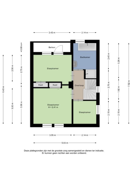 - Slaapkamer 3: ca. 2.75 x 3.43 m, met toegang tot balkon