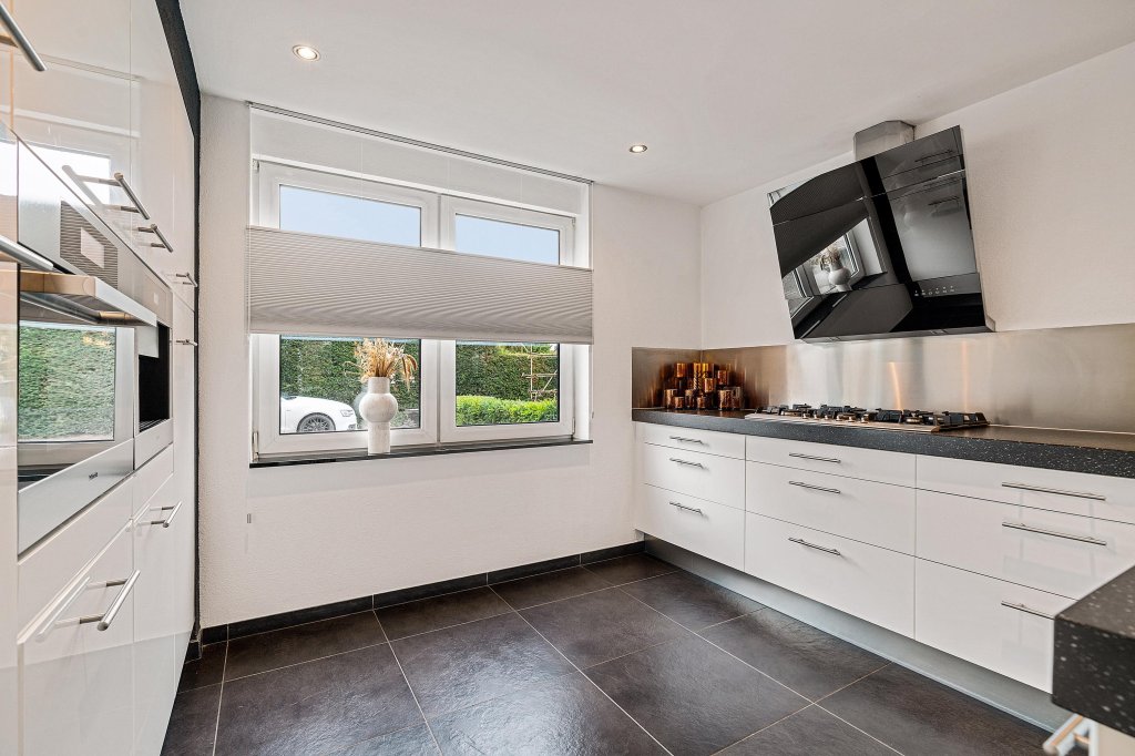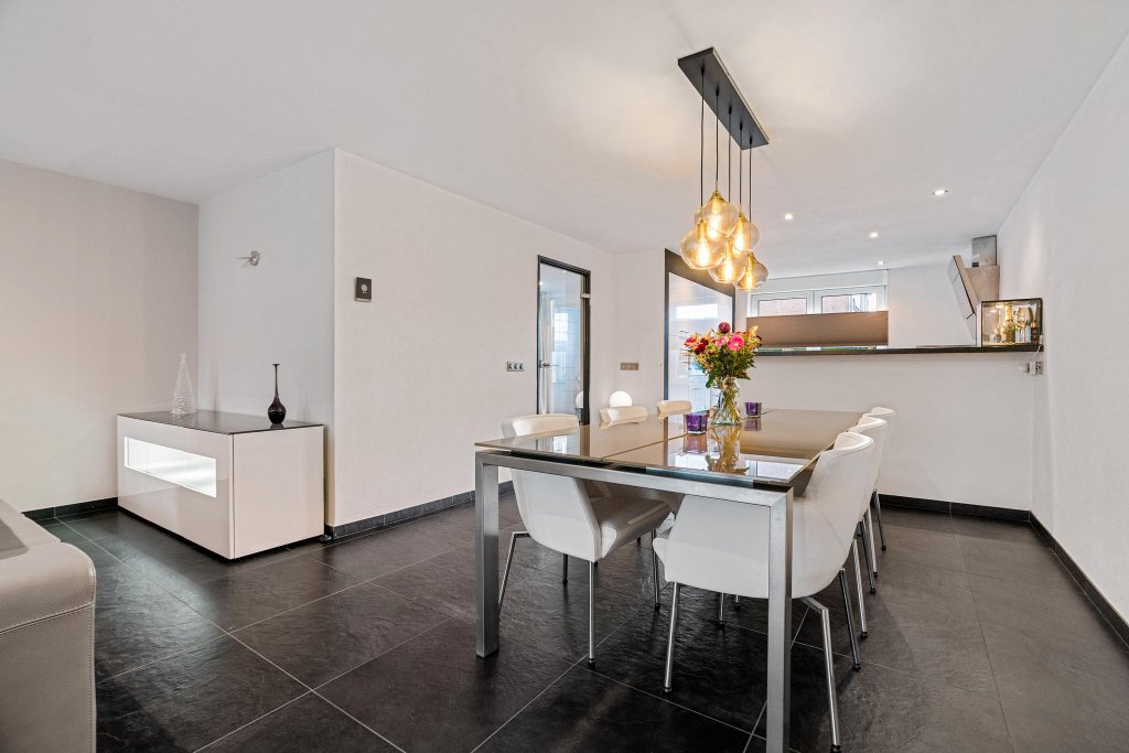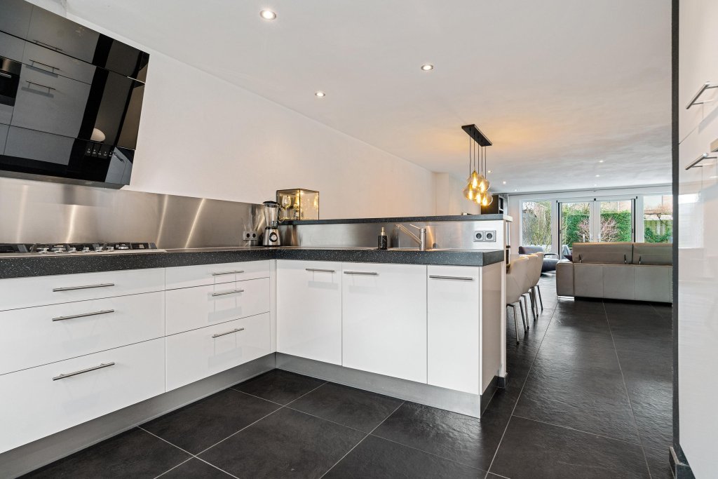 De eetkamer staat in open verbinding met de moderne keuken, die van alle gemakken is voorzien: 6-pits gasfornuis, afzuigkap, vaatwasser, combi-ovens, koelkast, diepvries en ingebouwd koffiezetapparaat. De woonkamer, eveneens verbonden met de eetkamer, is licht en ruim en biedt via openslaande deuren toegang tot de tuin. Tevens is hier een hor aanwezig.
