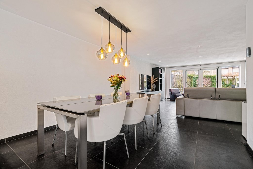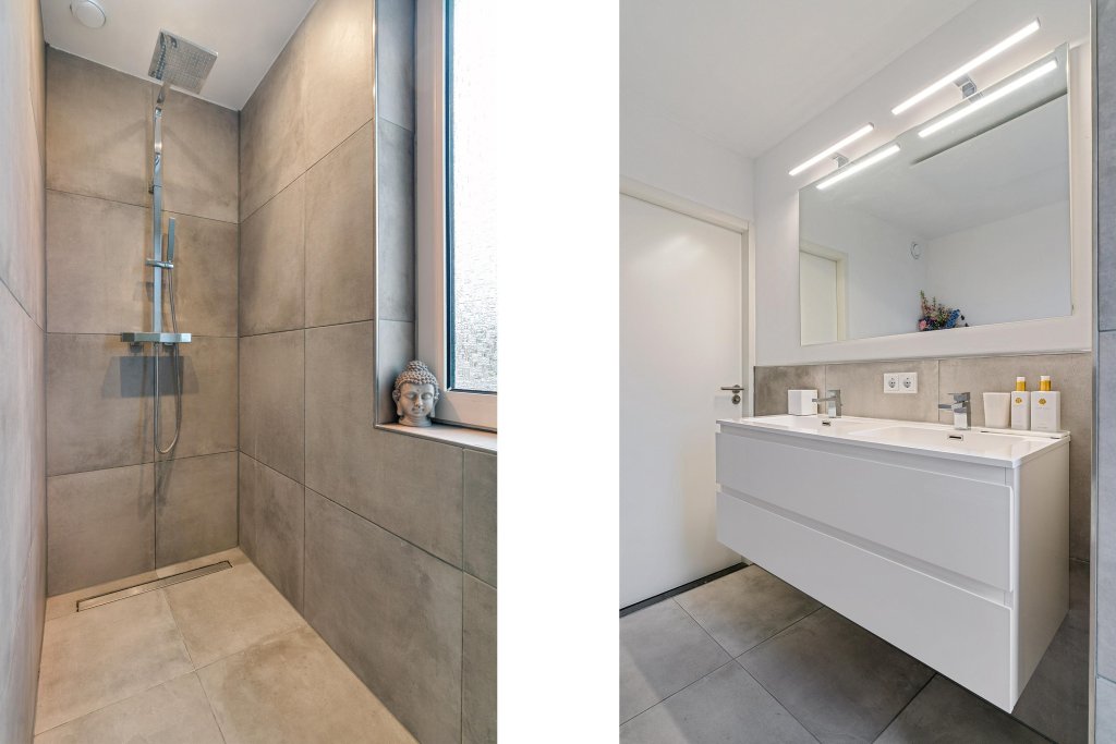 De gehele begane grond is betegeld en voorzien van vloerverwarming en sfeervolle spotverlichting. Het toilet is volledig betegeld en voorzien van een hangend closet en fonteintje.
